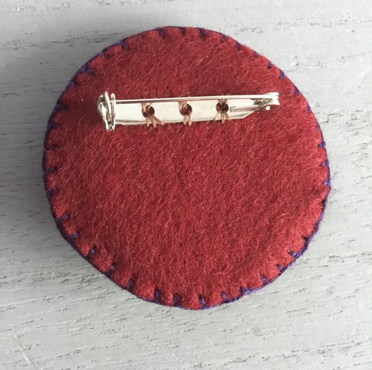 This hand embroidered brooch is 2 inches (5.50 cms) in diameter, a nice wearable size. A metal bar brooch pin with a safety catch for secure wear is sewn on the back.