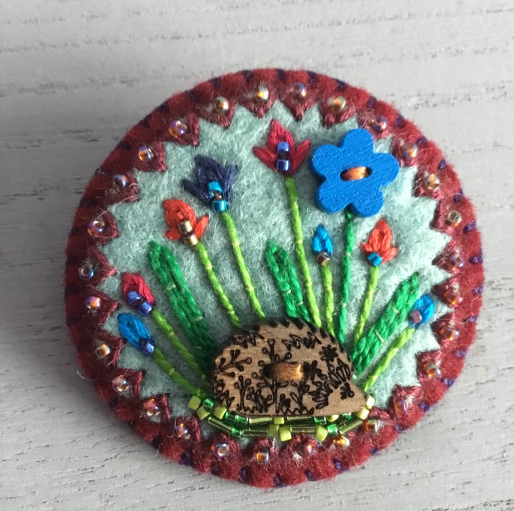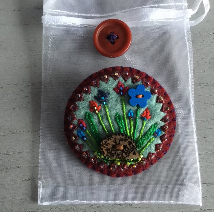 A floral scene is drawn with embroidery threads, beads and buttons, creating this Hand Embroidered Floral Hedgehog Brooch. A lovely wooden button engraved with a floral design is sewn onto circles of pale blue and garnet coloured wool felt. This Hedgehog is walking beneath a blue Blue Button Flower and hand embroidered Flowers in red, blue and navy blue embroidery threads and small beads. This circular brooch is edged with navy blue Blanket Stitches.