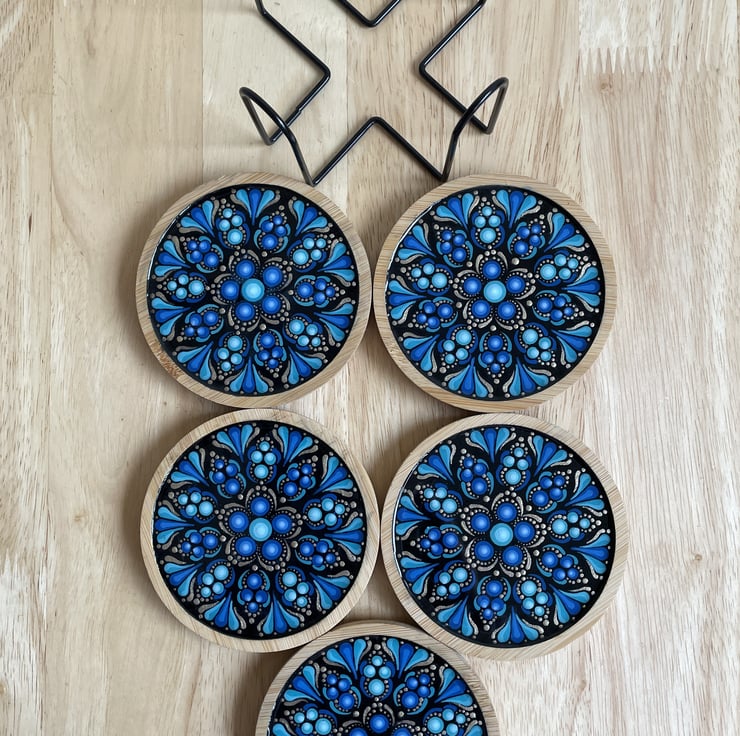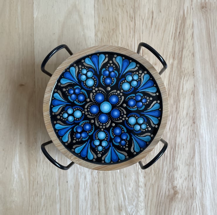 Coaster Size: 10cm Wide, 1.2cm Depth, Metal Coaster Holder Size: 11cm Wide, 7.3cm High - Set of 5 Blue Mandala Hand Painted Coasters With Metal Coaster Holder.