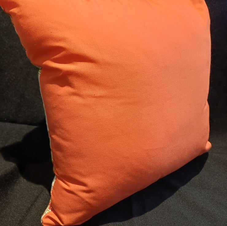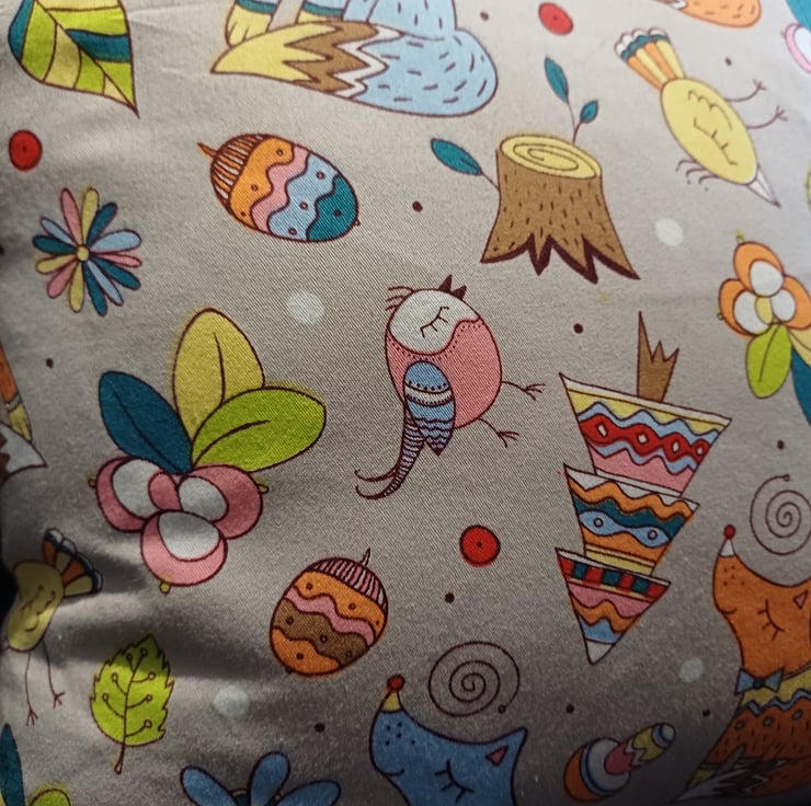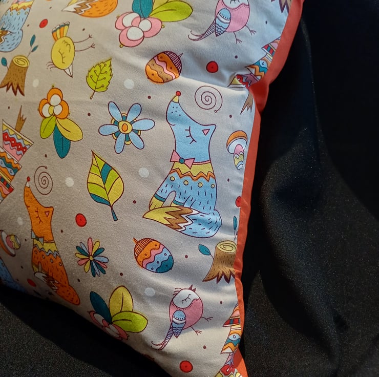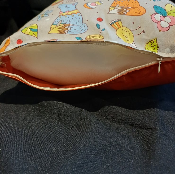 the cushion measures approximately 13 inches by 13 inches, there is a cute woodland design with a burnt orange backing, there is a zip at the bottom for easy washing, there is a polypropylene insert which is sponge wipe only, this will be a great addition to any nursery,