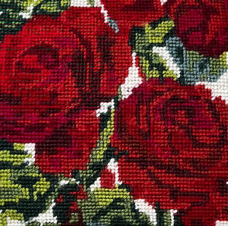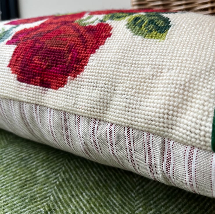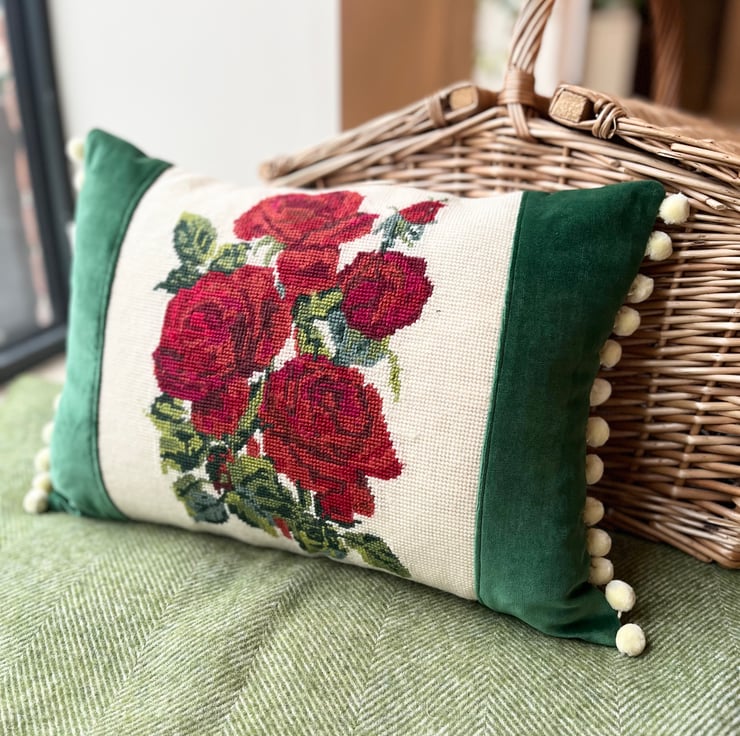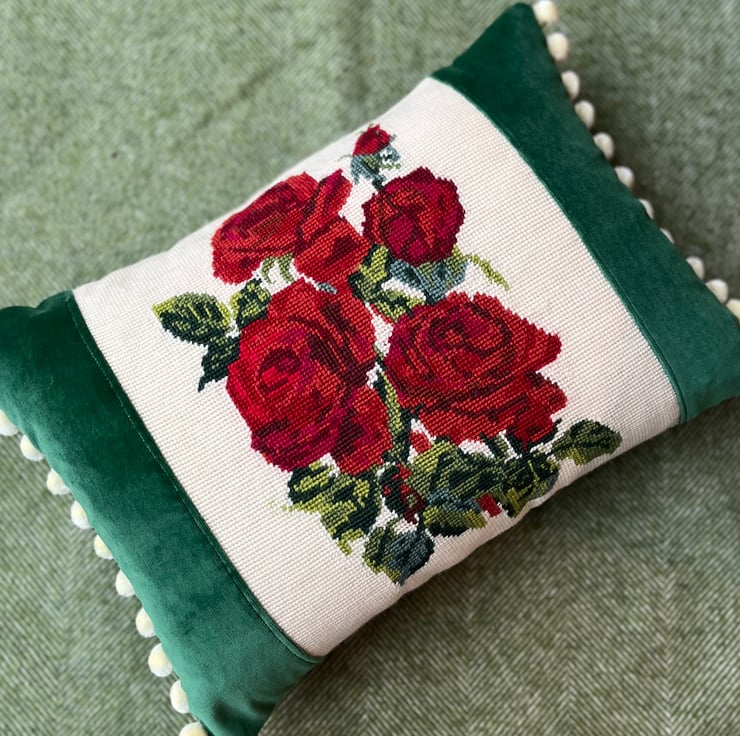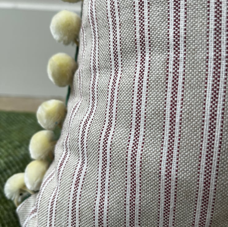 Beautiful one of a kind cushion cover with a pretty panel of vintage tapestry featuring a bouquet of red roses. I’ve added reclaimed green velvet fabric either side of the tapestry and the back is beige cotton with a soft red ticking style stripe. The ends are trimmed with velvety cream pompoms.
