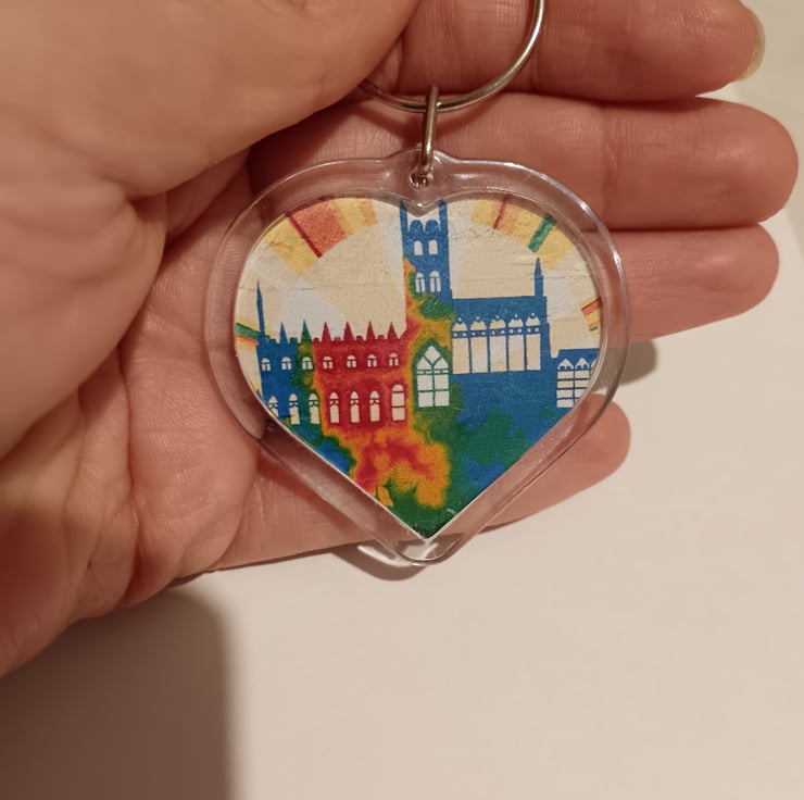 Colourful heart shaped keyring featuring a graffiti street art styled image of Gloucester Cathedral.