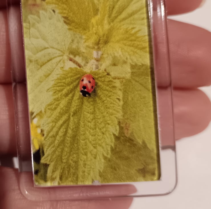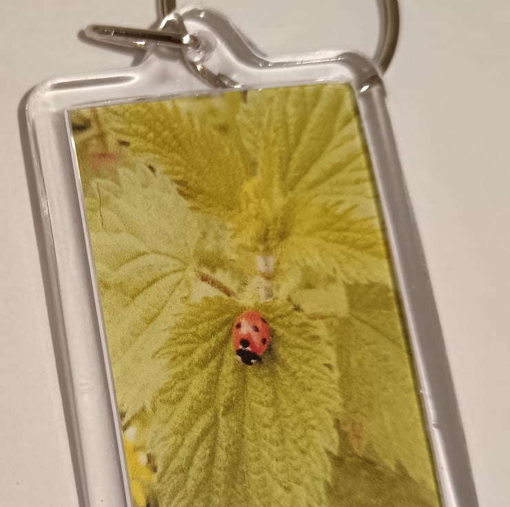 Colourful ladybird themed keyring featuring a beautiful ladybird on a stinging nettle.