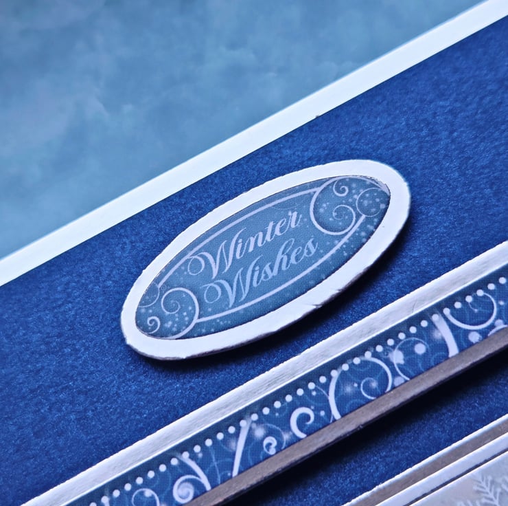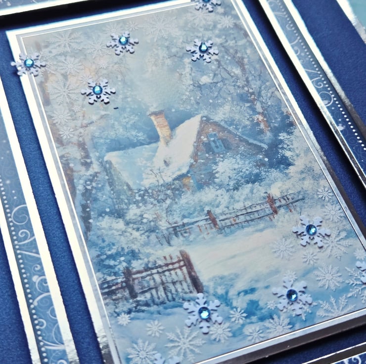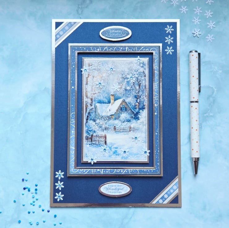 Made of a white card base layered with chrome silver mirror card & royal blue pearl cardstock. The main image is surrounded by a matching frame & features a snow-covered cottage nestled among frosty trees, a peaceful winter landscape that captures the magic of the season. The sentiments "Winter Wishes" & "Enjoy The Wonderful Moments" are laying above & under the frame, with decorative strips embellishing the two opposite corners. Finished with snowflake embellishments & small craft gemstones in light blue. The card's luxurious feel carries on to the inside, with a matching insert panels on both sides. On the left, the sentiment "Best Wishes" is stamped in blue, decorative font.