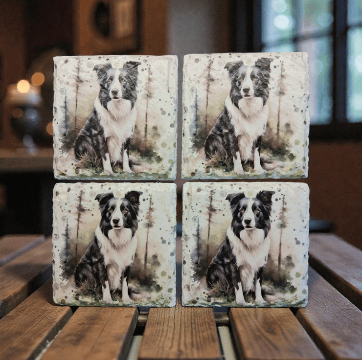 This 4 piece slate coaster set has been hand painted and decoupaged with a beautiful Black and White Border Collie Dog.