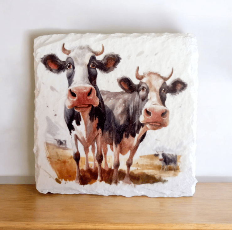 This 4 piece slate coaster set has been hand painted and decoupaged with beautiful funny black and white cows.