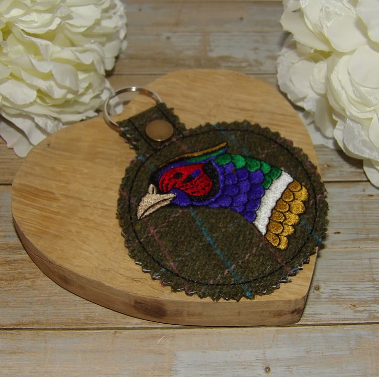 Lovely tweed bag charm or keyring with an embroidered Pheasant on it is apprx 3 inches wide so a good size to be seen