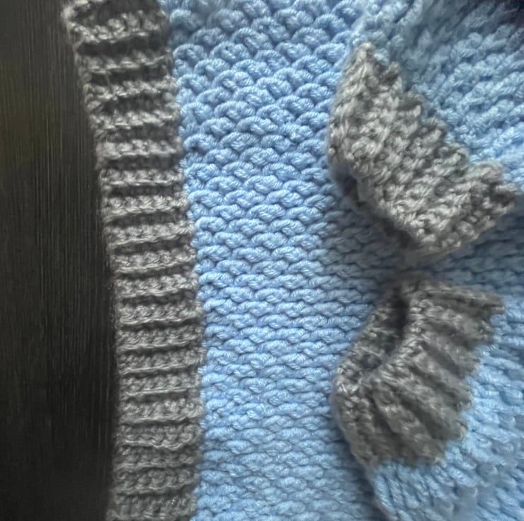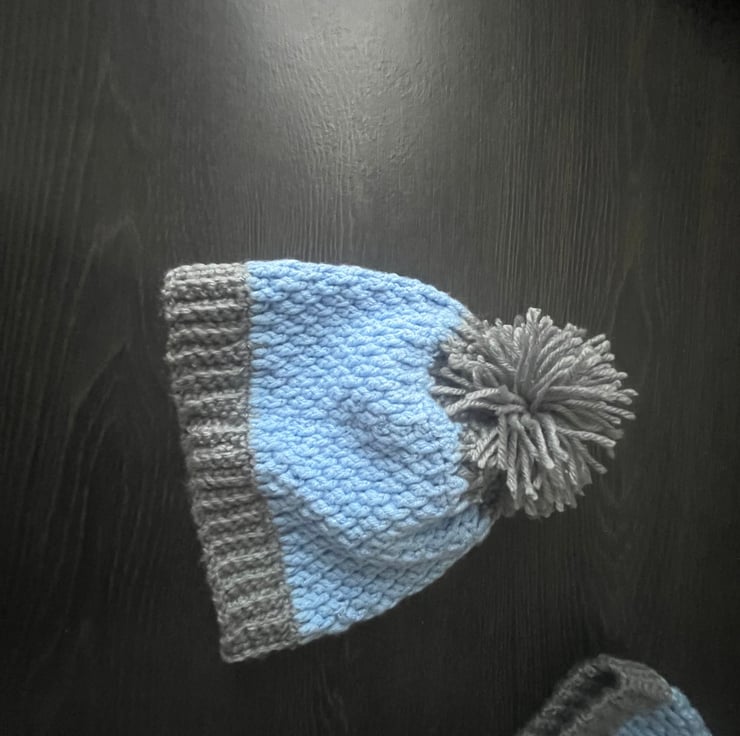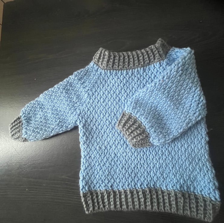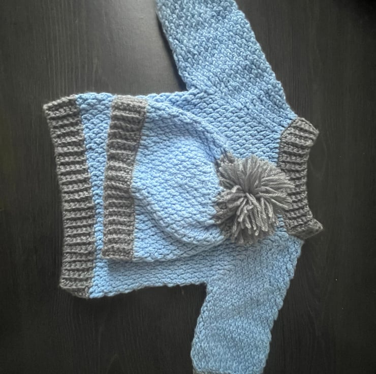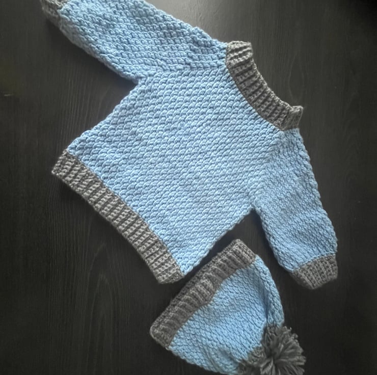 Adorable baby sweater and beanie set, perfect for little ones to stay cozy. These soft nice sky blue sweater with round neck and long sleeves and matching beanie hate have grey borders, the two colours of blue and grey make it more attractive, hate have sweet Pom Pom on the top.Made from super soft yarn, this set is ideal for chilli days . The sweet details and comfortable fit make it must-have for baby’s wardrobe.