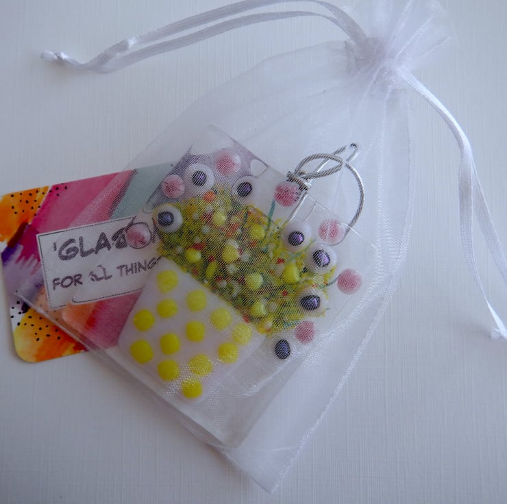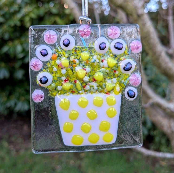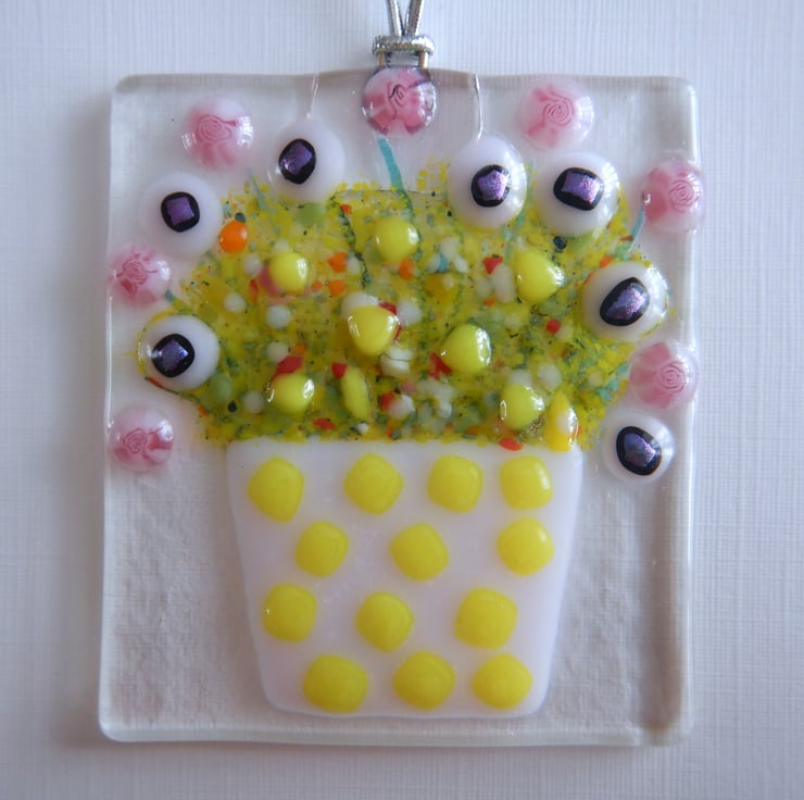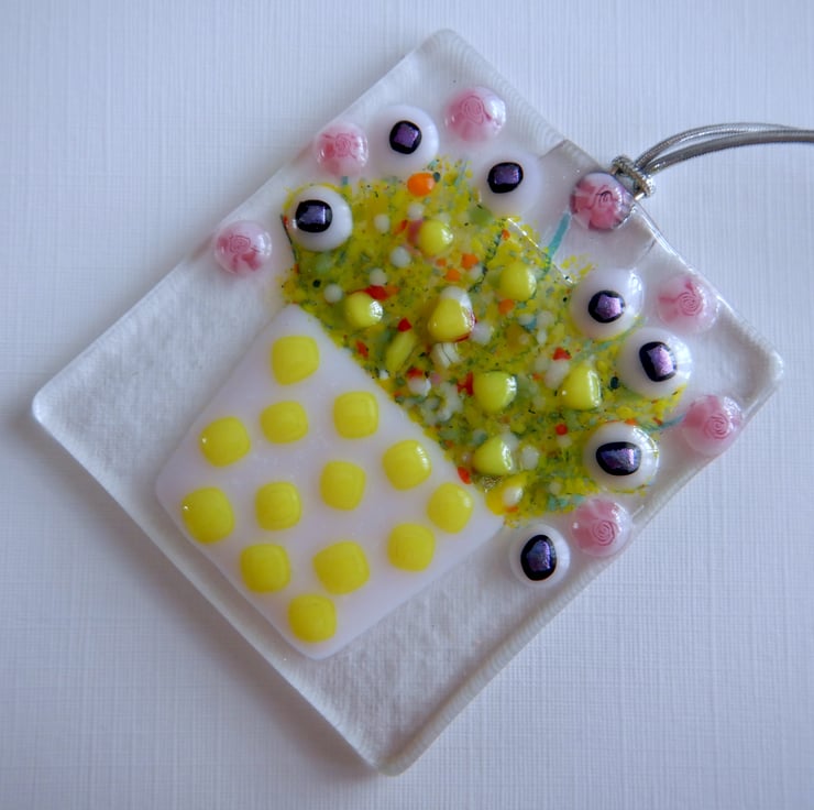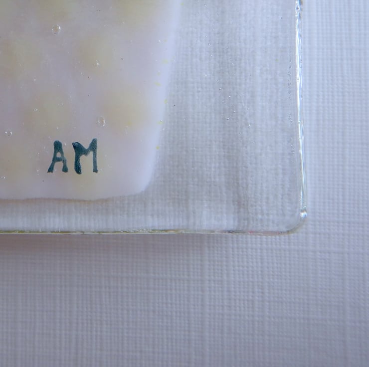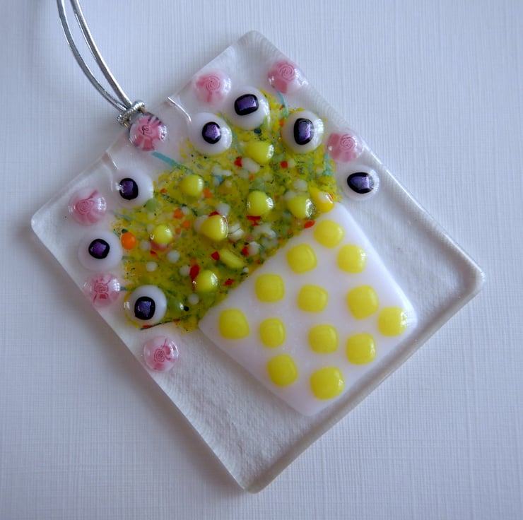 It started off being a simple sheet of transparent fusing glass. The flowers and details were then added using a combination of coloured sheet glass, frit glass, dichroic glass, millefiori beads, and glassline powder.
