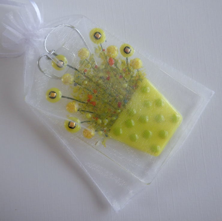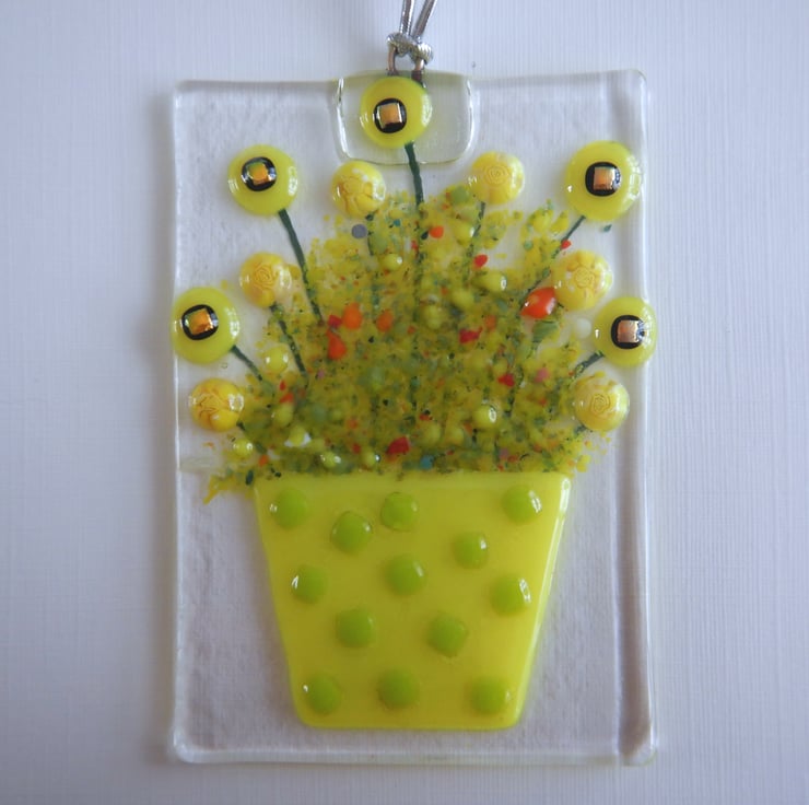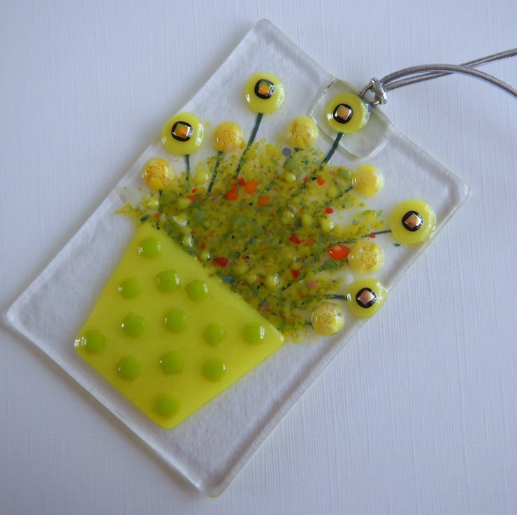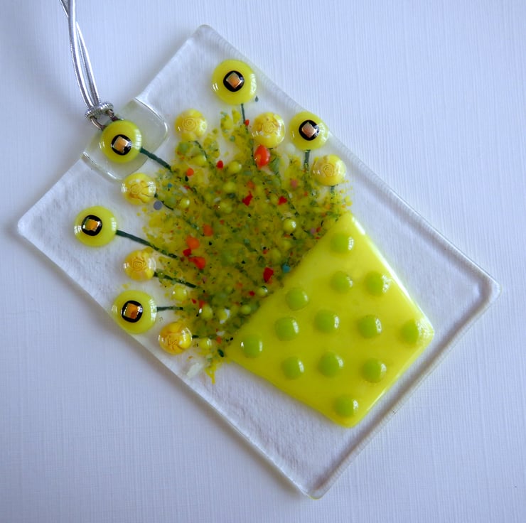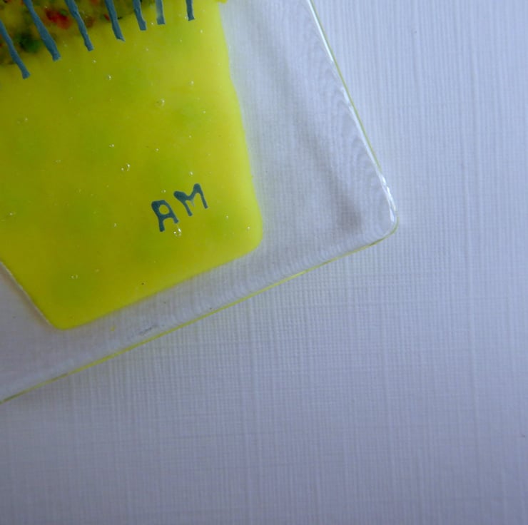It started off being a simple sheet of transparent fusing glass. The flowers and details were then added using a combination of coloured sheet glass, frit glass, dichroic glass, millefiori beads, and glassline powder.
