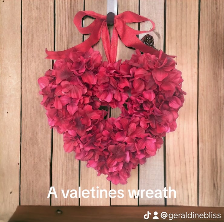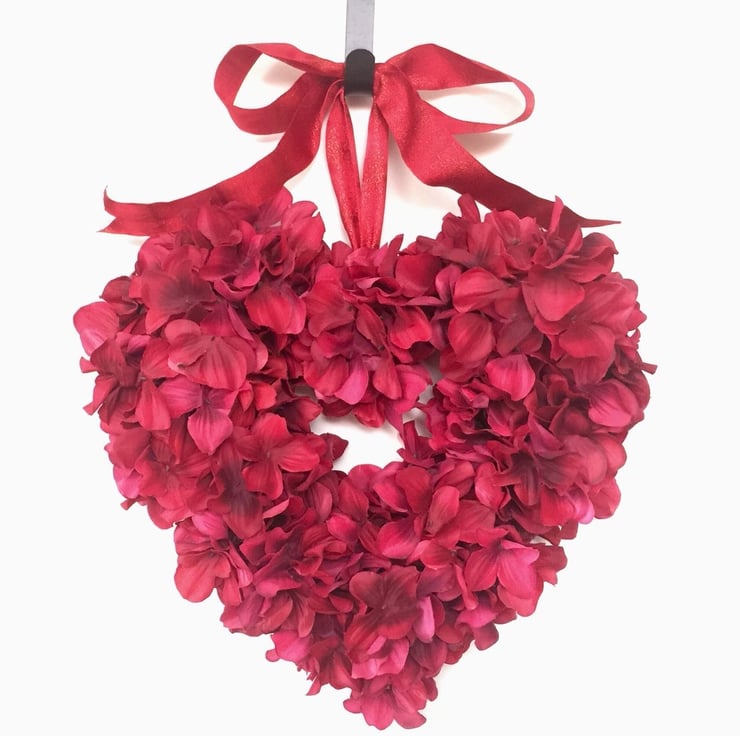 A artifcal hydrangea red wreath set on a heart farm with red ribbon