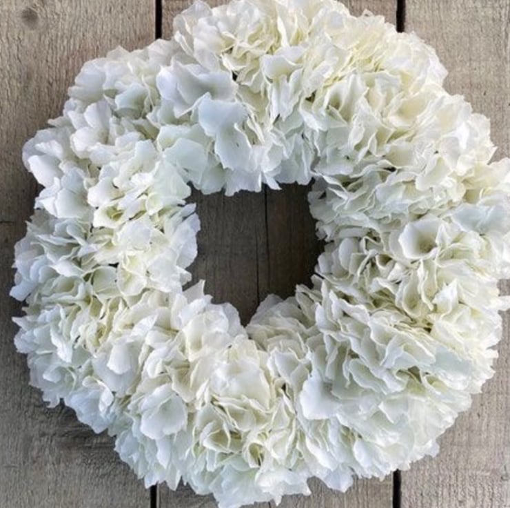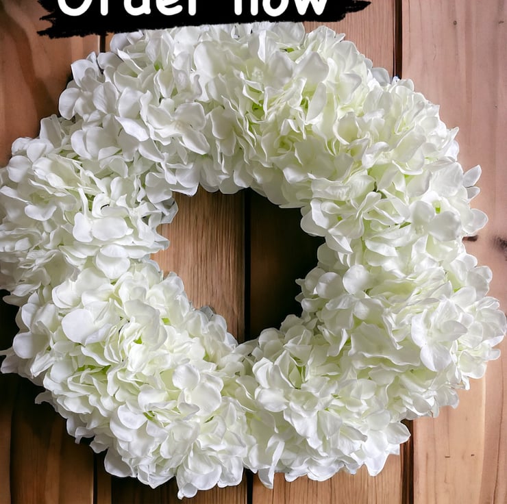 Set on a 30cm wreath frame wire these white hydrangeas at the frame of a clean and bright door