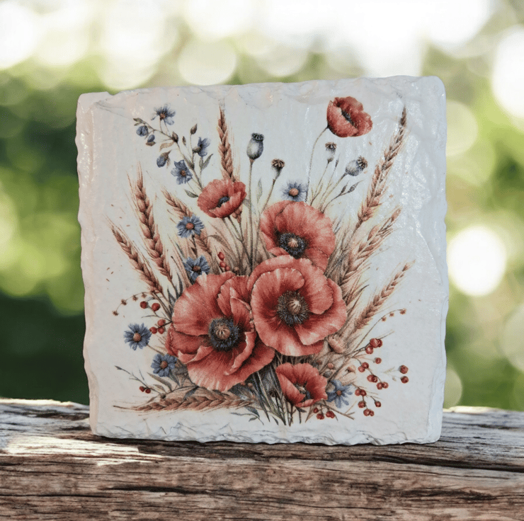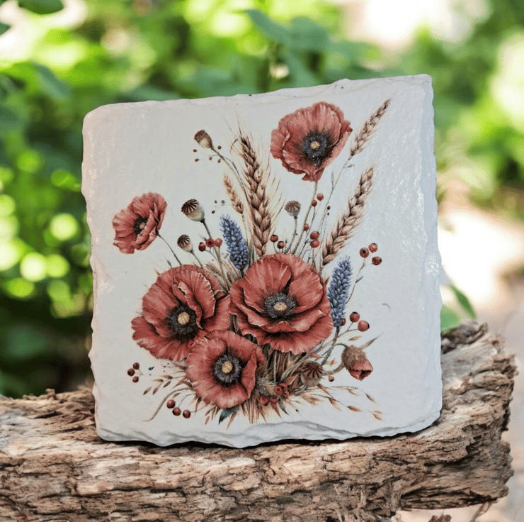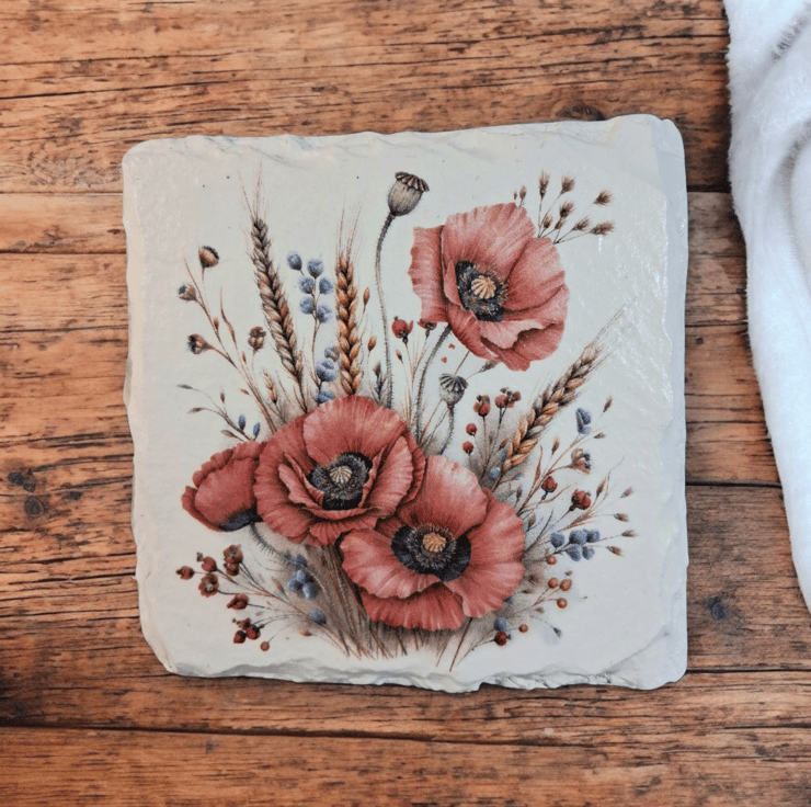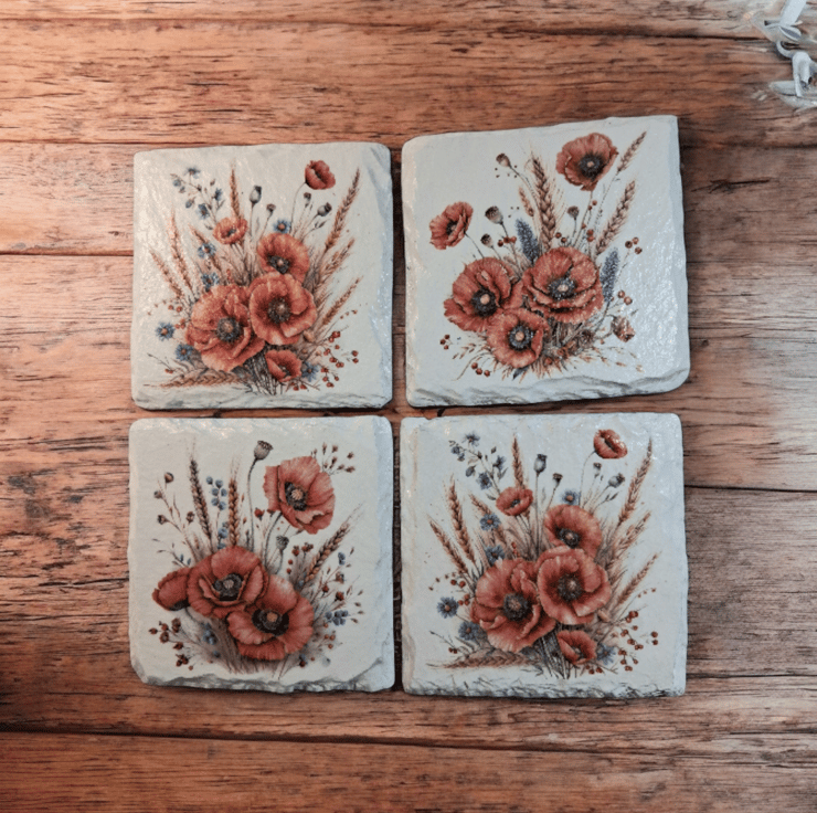 This 4 piece slate coaster set has been hand painted and decoupaged with beautiful Red Poppies.