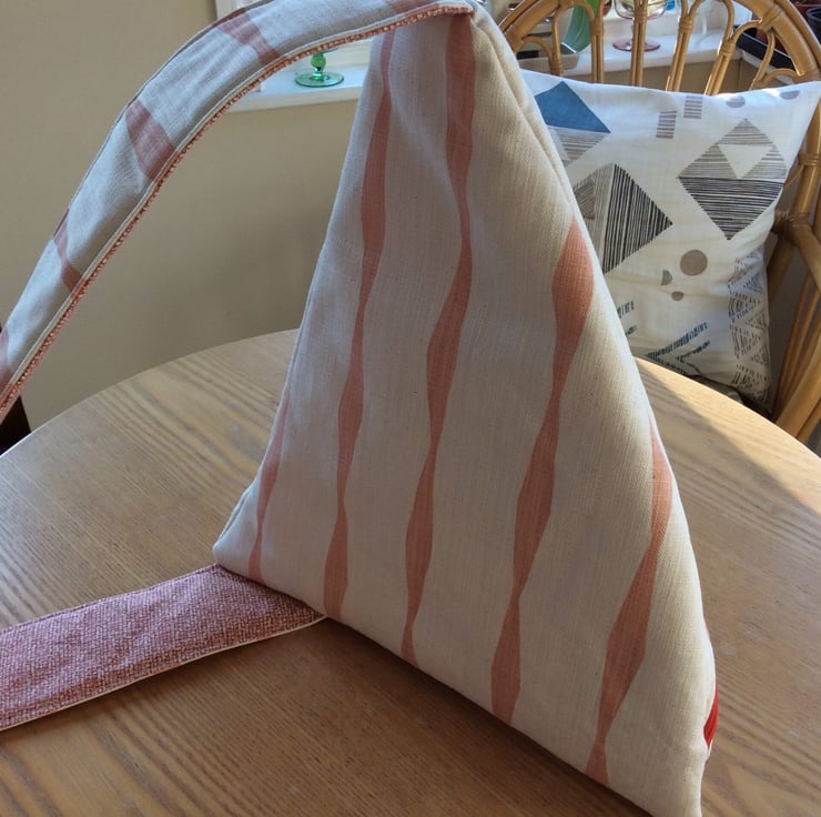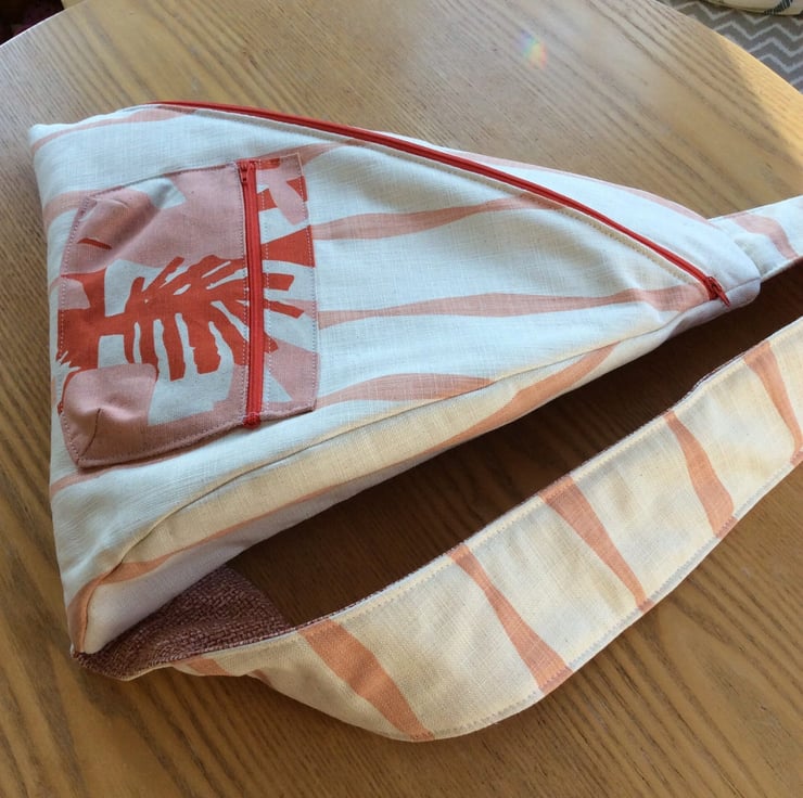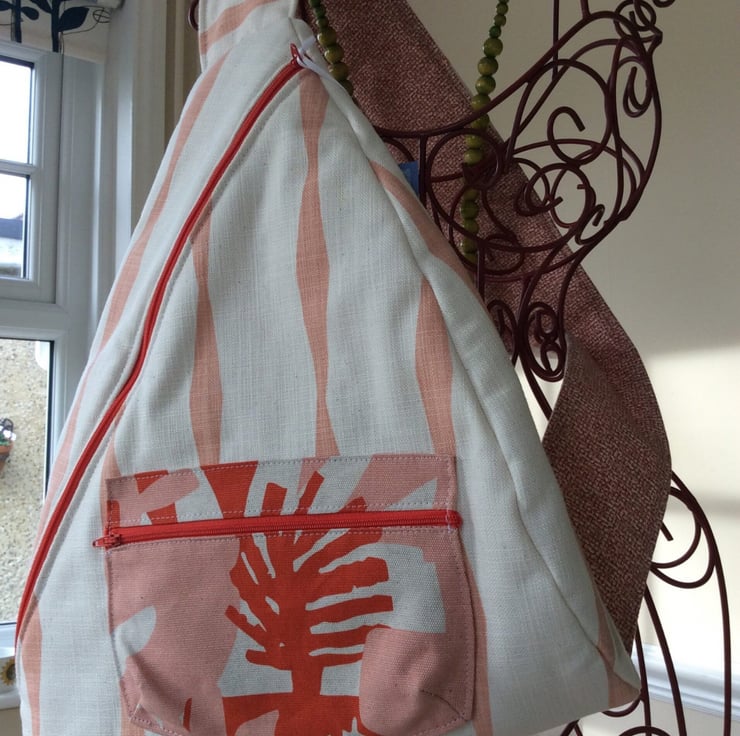 An unusual asymmetrical bag with a single wide strap that fits across the body and is shaped so that the bag sits comfortably on your back.