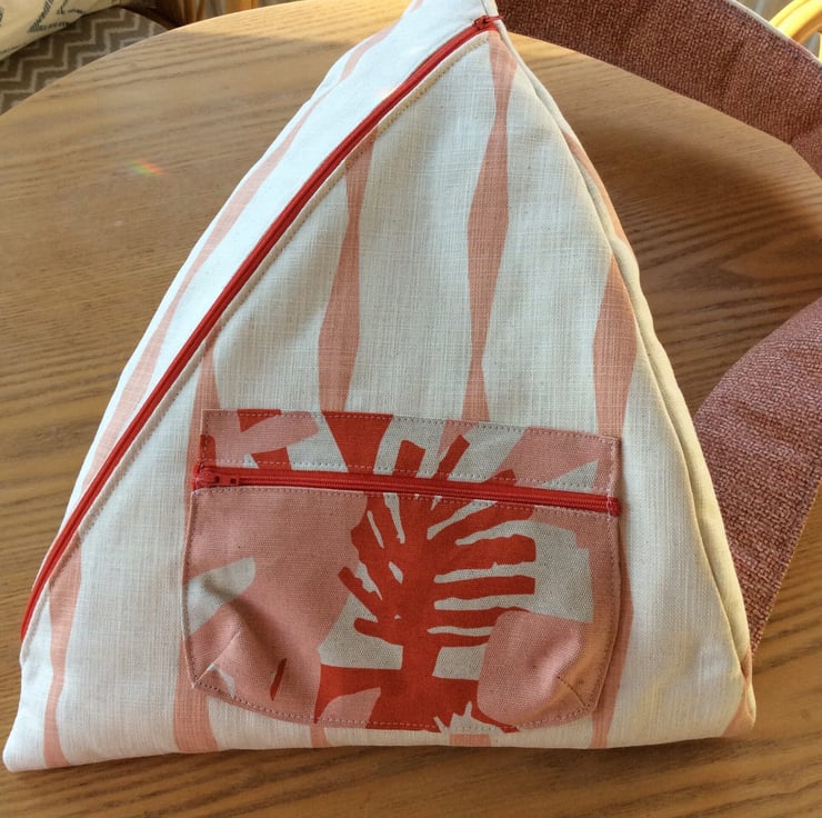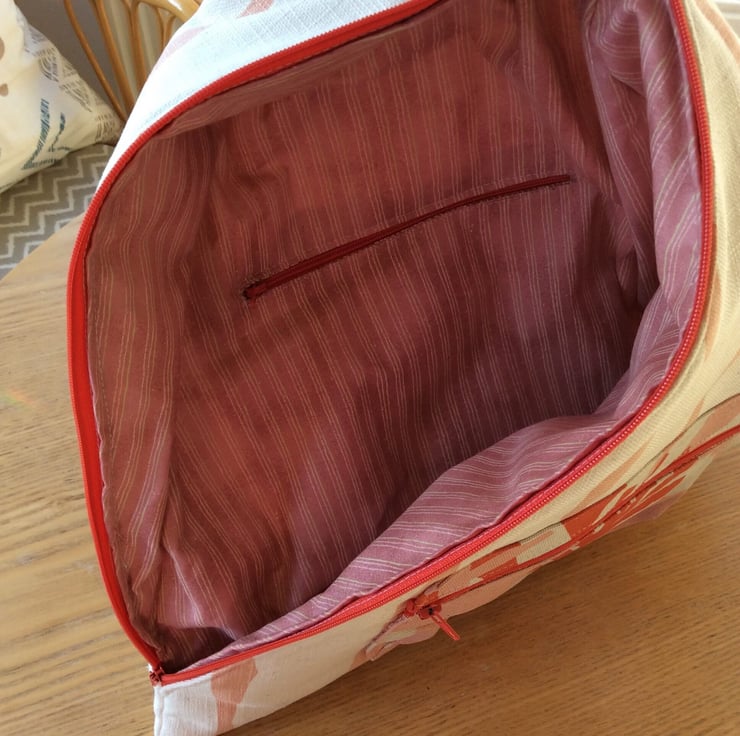 The outer is made in Skinny laminx designer fabrics, sourced from South Africa and rarely found in UK, making this a unique bag. There’s a funky zipped pocket on the outside. The inner and the back of the strap have contrast linings and there’s another zipped pocket inside to keep your keys safe. It’s quite a statement piece. You won’t see another like it!