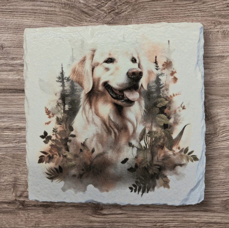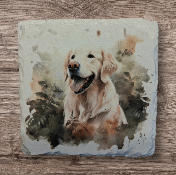 This 4 piece slate coaster set has been hand painted and decoupaged with beautiful Golden Retrievers in various settings.