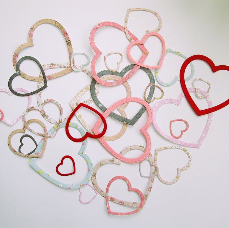 3 sizes of assorted heart outline die cuts, 10 different patterns, 30 hearts in total with 10 of each size.