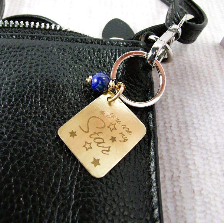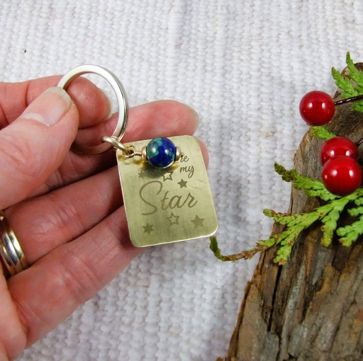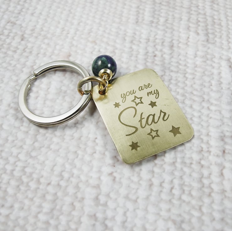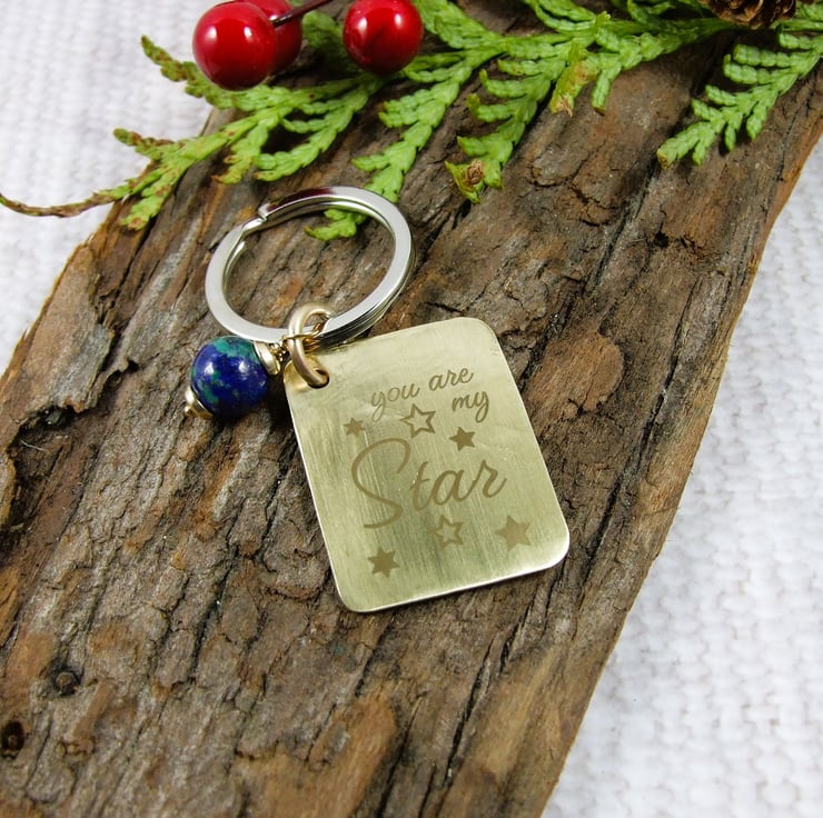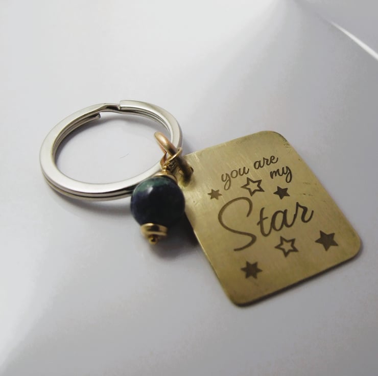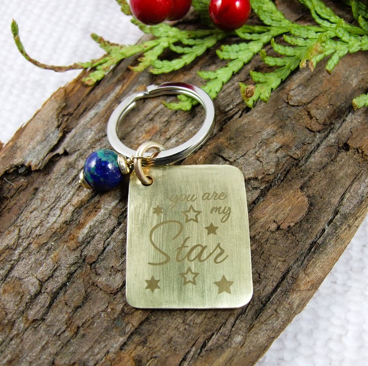 Keyring, hammered brass heart laser etched with message 'you are my star' with stars paired with crysocolla gemstone.