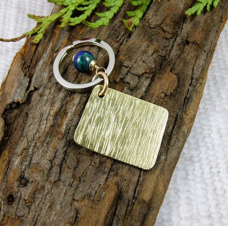 I have created the bag charm using .5 mm thick flat brass sheet, cut by hand into a tag shape and hammered on one side. On the other side I have used artists software to design the message and engraved this pattern onto the brass with a laser tool. I have paired with an 8mm crysocolla gemstone and copper beads, securely wire wrapped in place. Fitted to a 25mm steel spiral ring.