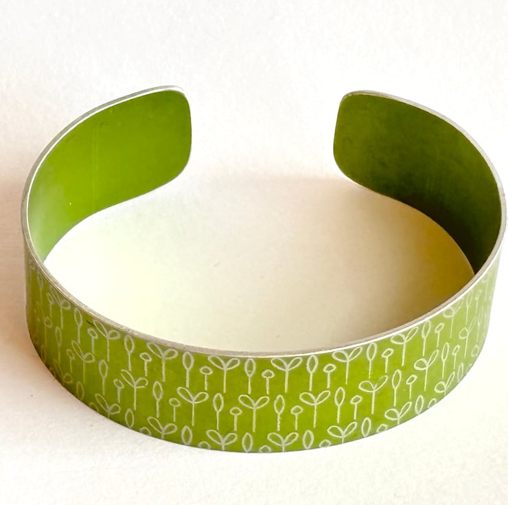 A striking bracelet/cuff made from anodised aluminium with a pattern designed digitally by me. I made the drawing into a resist and applied it to the metal. I then dye the aluminium, seal it and remove the resist which leaves the pattern showing in the original colour of the metal. The cuff is then made using traditional metalworking techniques.
