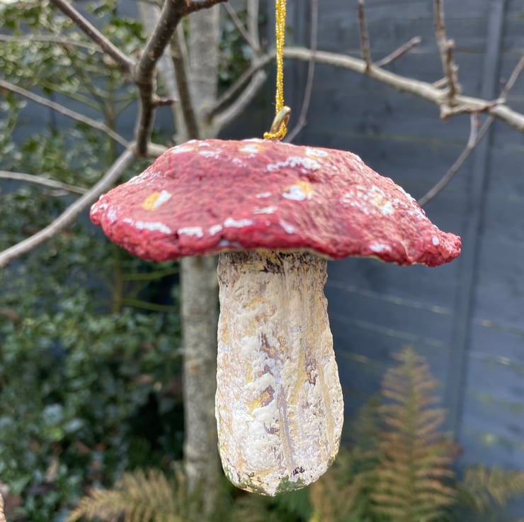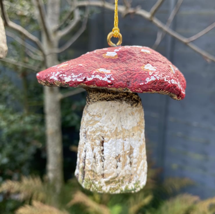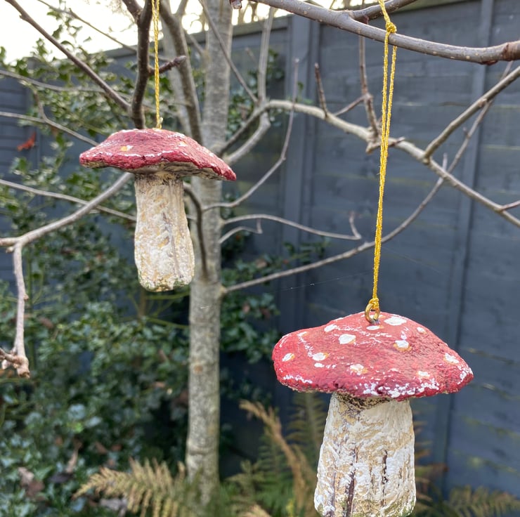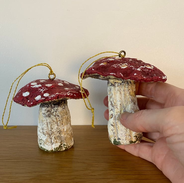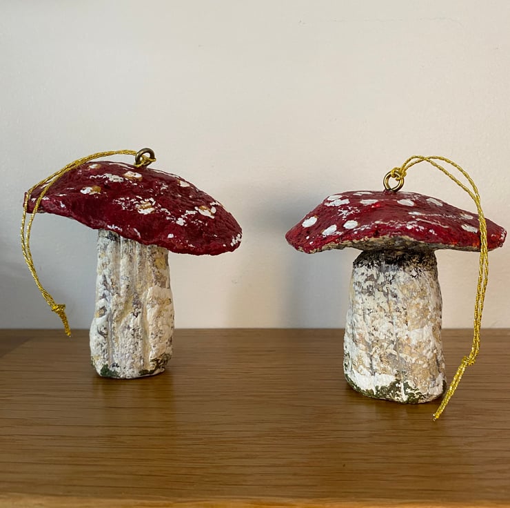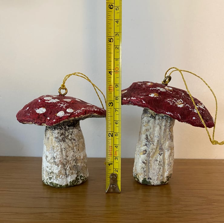 Pair of non identical hanging mushroom/toadstool/fungi decorations made from recycled paper mache. Painted with the distinctive red and white spotted caps and cream stems of the fly agaric fairy toadstools.