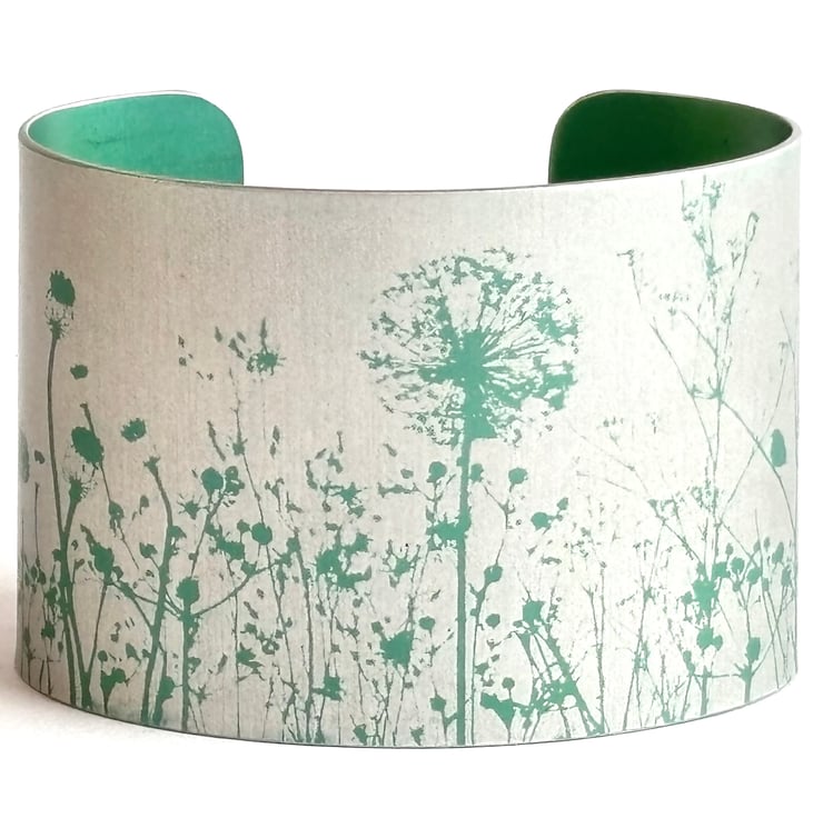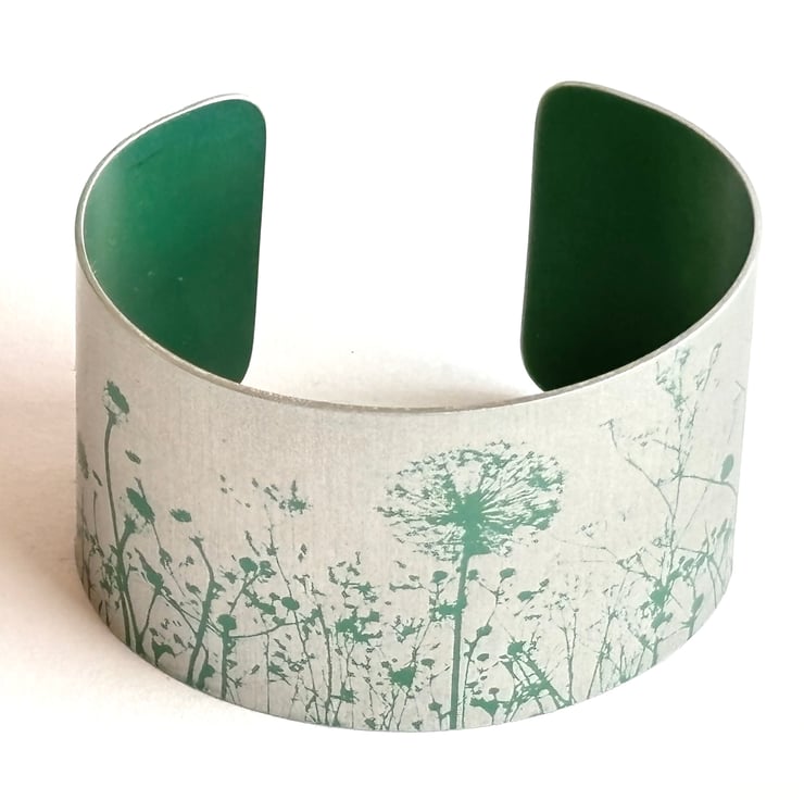 A striking bracelet/cuff made from anodised aluminium with a pattern designed digitally by me. I made the drawing into a resist and applied it to the metal. I then dye the aluminium, seal it and remove the resist which leaves the pattern showing in the original colour of the metal. The cuff is then made using traditional metalworking techniques.