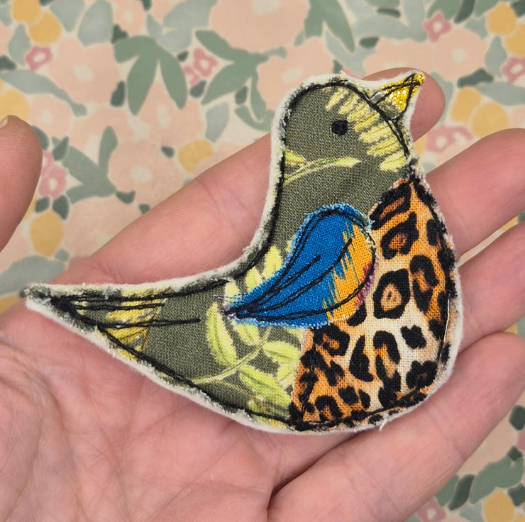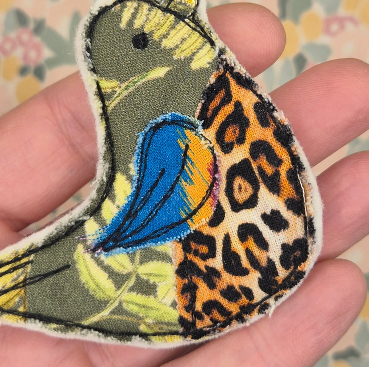 A gorgeous, hotpotch bird brooch/badge made from an eclectic selection of cotton fabrics.