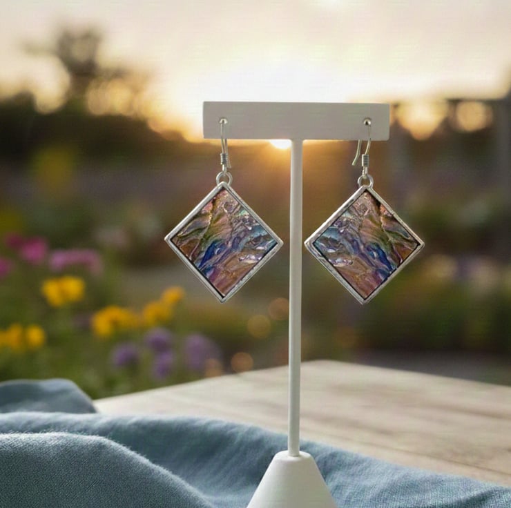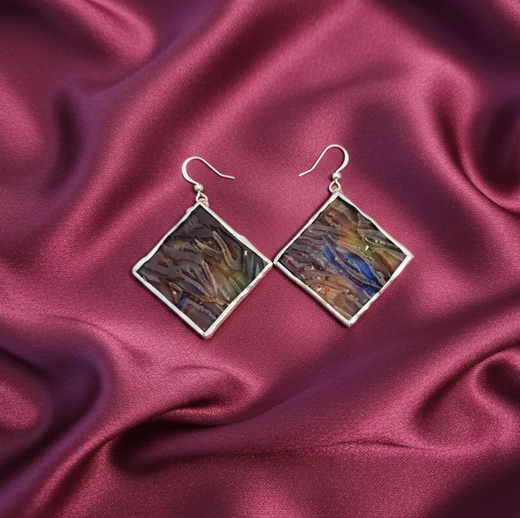 Handmade Stained Glass Dangle Earrings: Dark blue Textured Geometric Jewelry