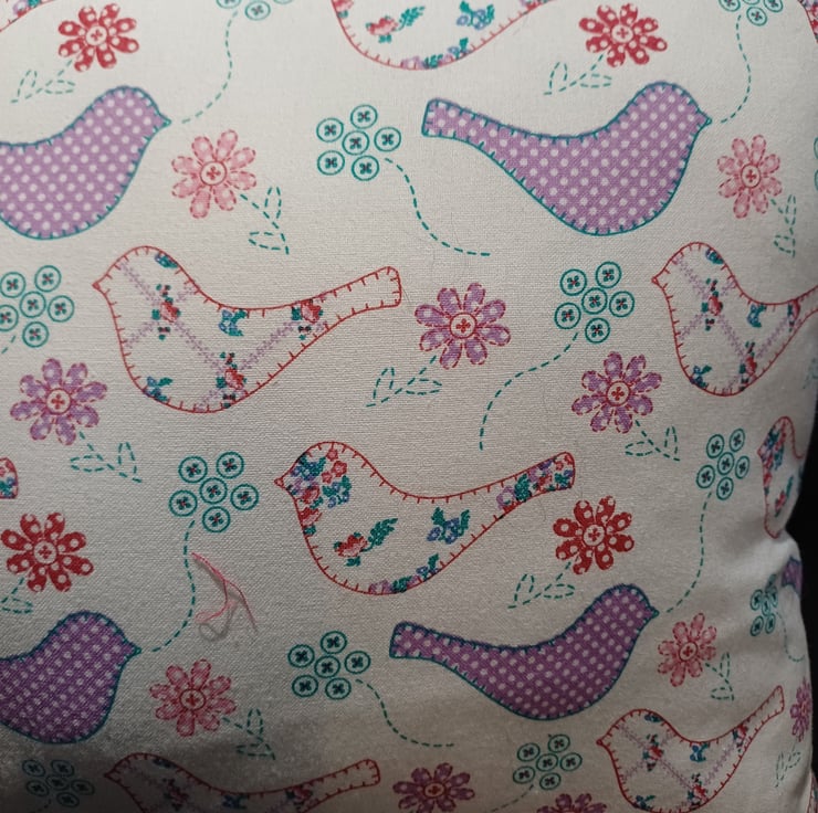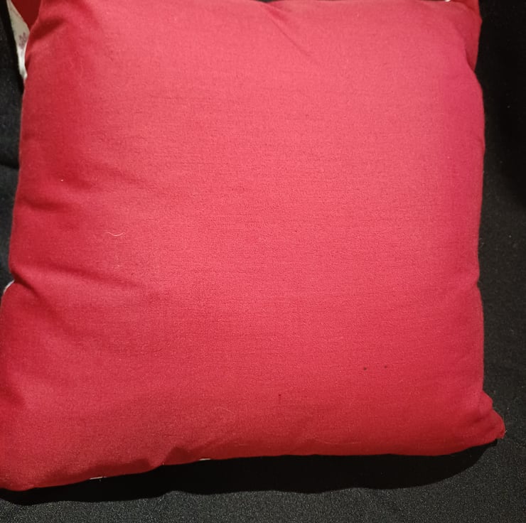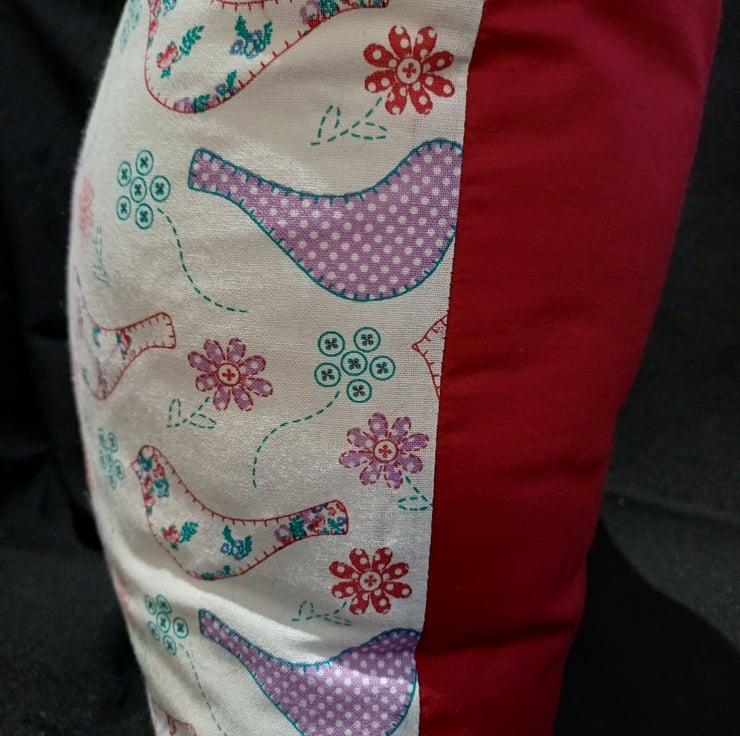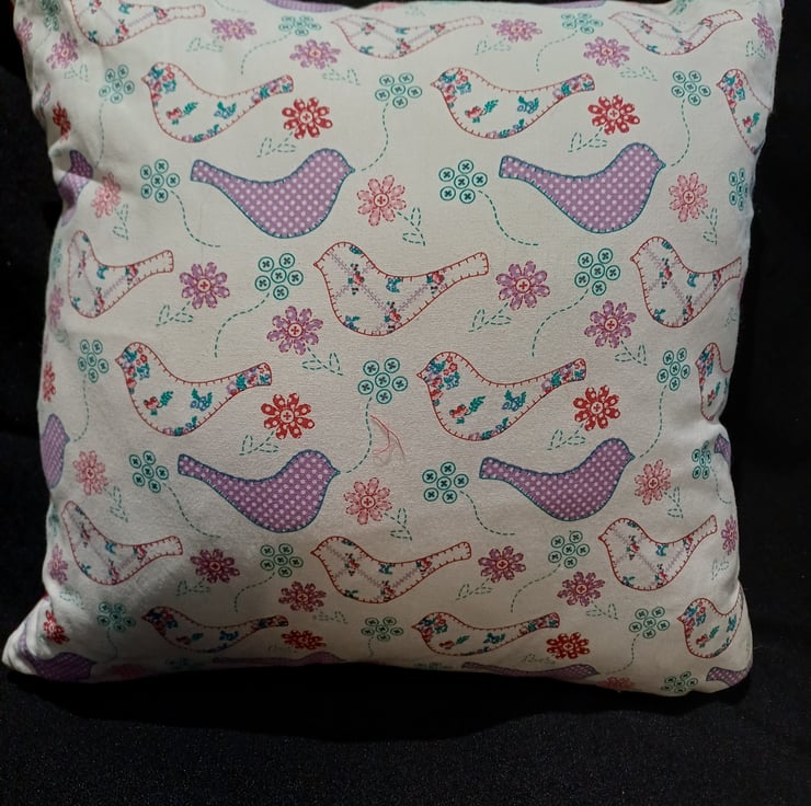 This beautiful cushion has a lovely bird themed, the front is made of a bird themed print on cotton with a stunning red for the backing. there is a zip for easy cleaning the polypropylene insert this is sponge clean only. it measure 13 inch by 13 inch approx.