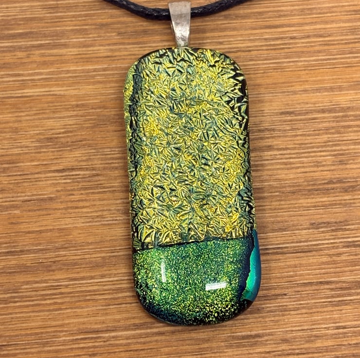 Each pendant is entirely unique – this one features a mix of glittering gold and green on black base beneath the surface.