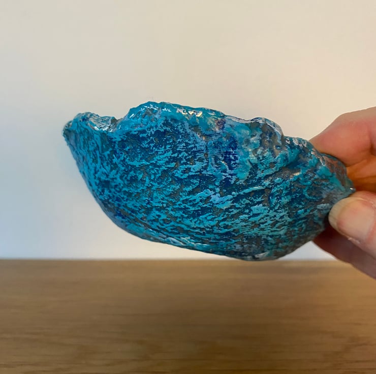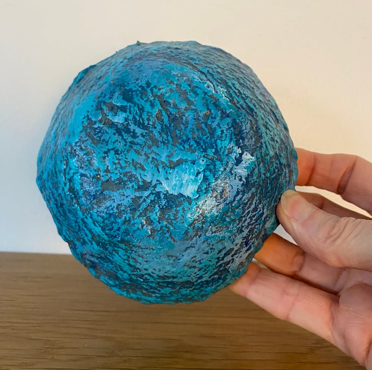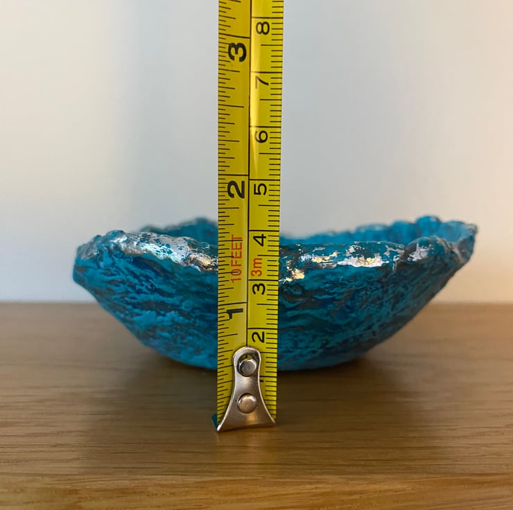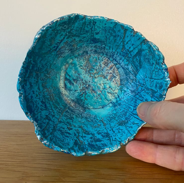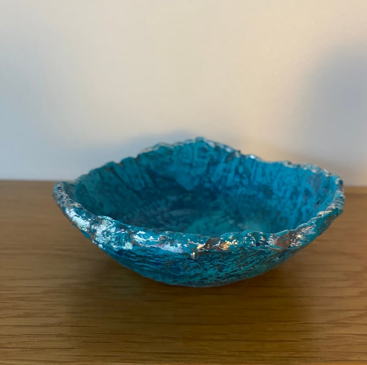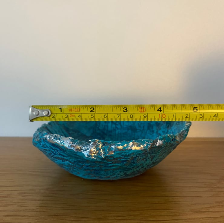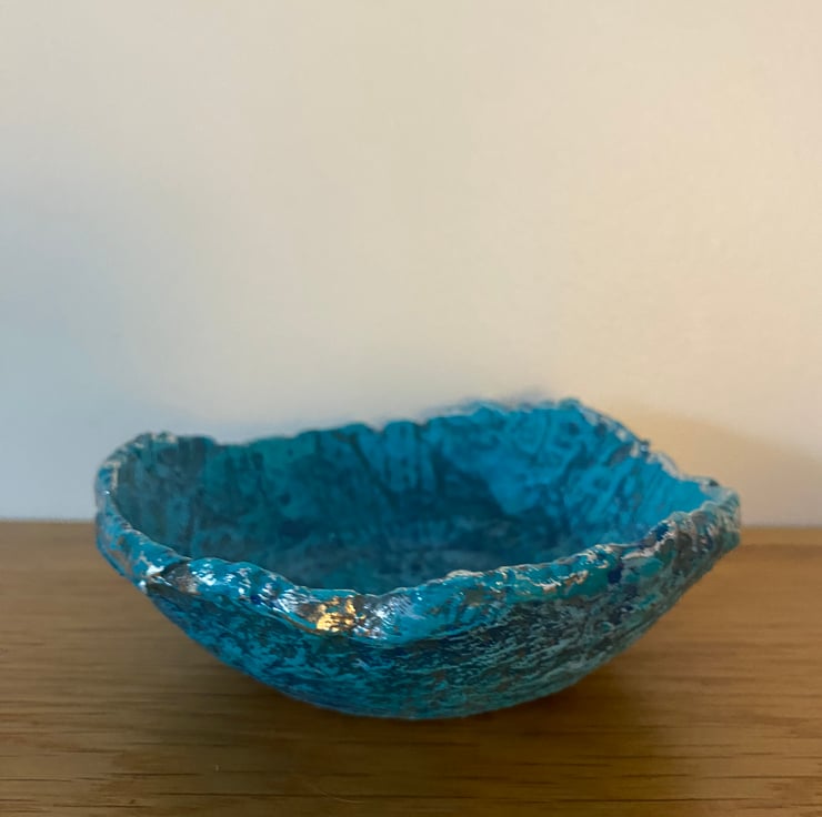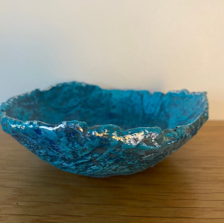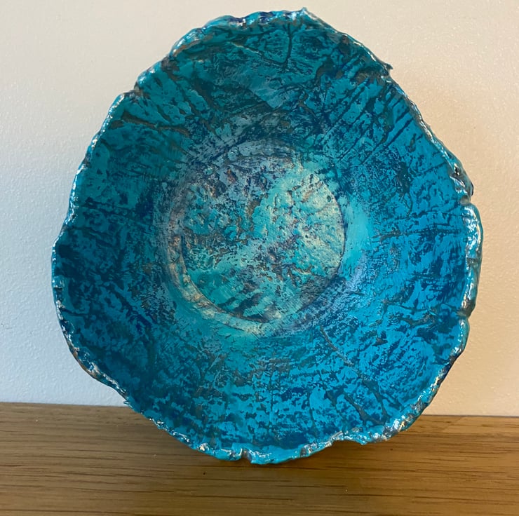 Painted with layers of blue and turquoise to highlight the texture of the paper mache. Then varnished for protection. The rim has been given a touch of silver gilding foil.