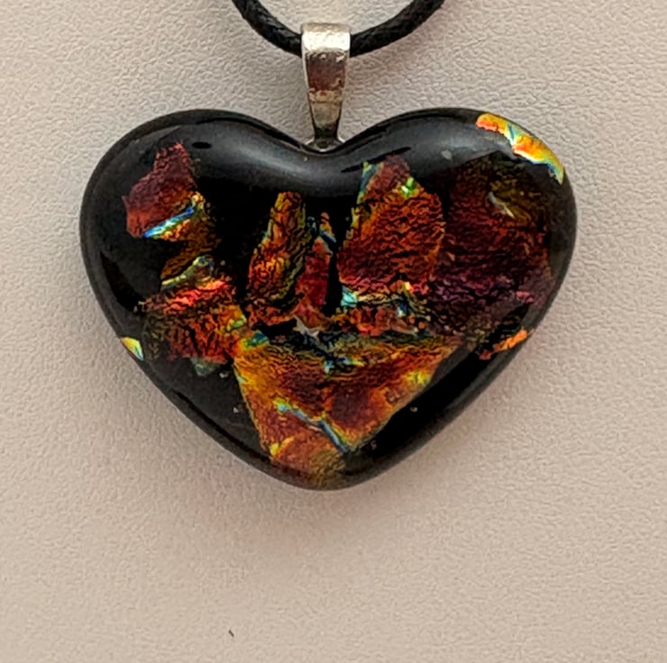 Fused glass heart shaped pendant made with dichroic glass.