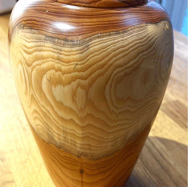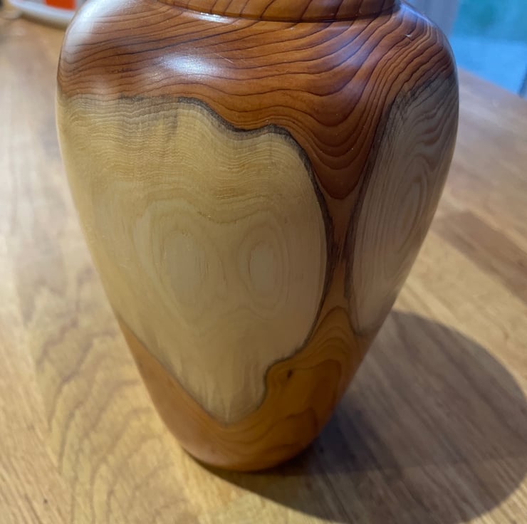 Chosen from a yew in my neighbours back garden. Sadly the beautiful tree was causing damage to the house. I was gifted this beautiful wood and as I turned this piece, the beauty of the wood spoke out. It is so different from any other piece I have turned. A real beauty.