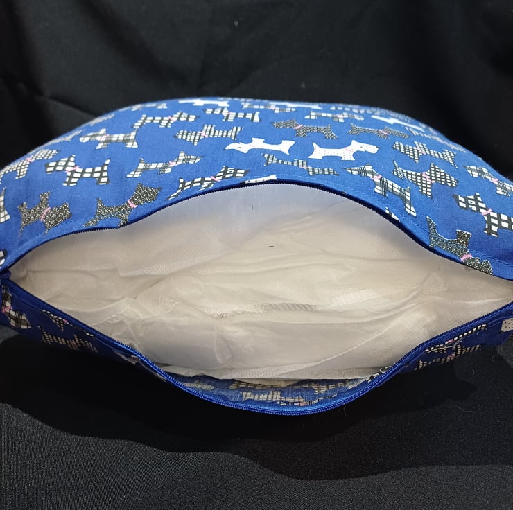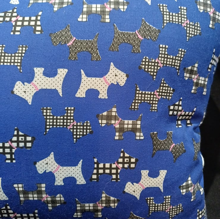 This cushion would go perfect with anyone who love Scottish terriers, the background is a royal blue with Black and white dogs , it is the same as both side , there is also a zip at the bottom to make it easy for washing, the polypropylene insert is sponge clean only, it measures approx. 15 inches by 13 inches