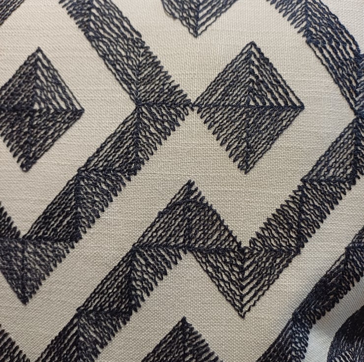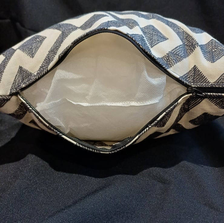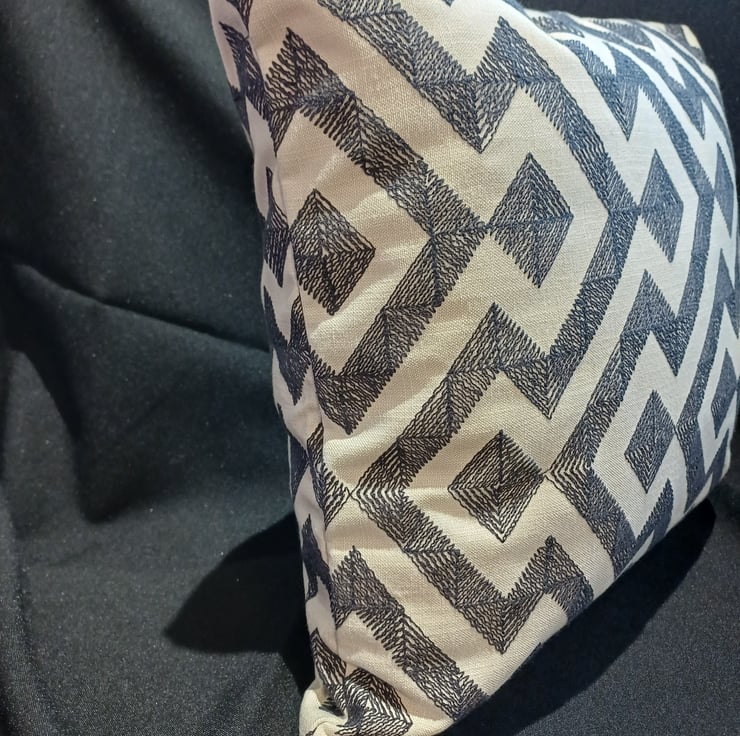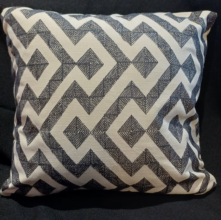 this lovely cushion is made from fabric from John Lewis, it is called Meeko a beautiful geometric print. it is the same on both sides, there is a zip for easy washing and the polypropylene inter is sponge clean only.it measures14 inches by 14 inches approx. the fabric has a good quality feel to it.
