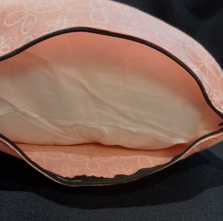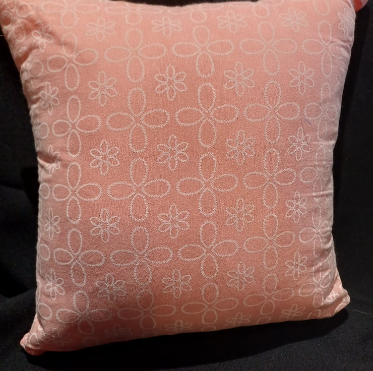 This beautiful cushion is a beautiful peach stich look print, the feel is nice and soft, the cushion measures 13 inches by 13 inches approx. there is a zip for easy washing the polypropylene inter is sponge clean only. This would look lovely in a bedroom or a cosy chair.