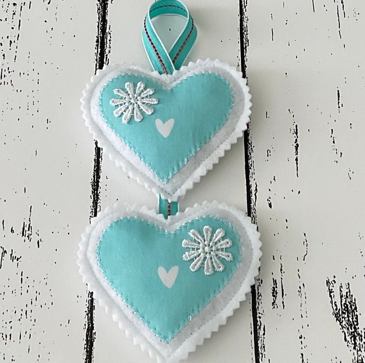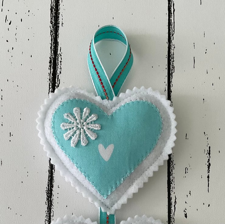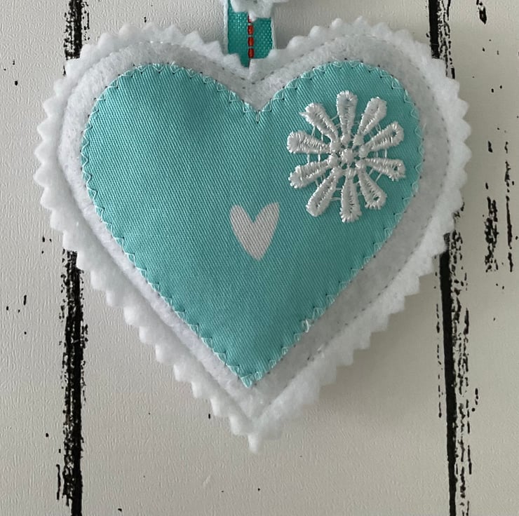 This handmade hanging heart decoration features two felt and turquoise fabric hearts, filled with beautifully scented French dried lavender, delicately embellished with white floral details and finished with a ribbon loop for hanging.