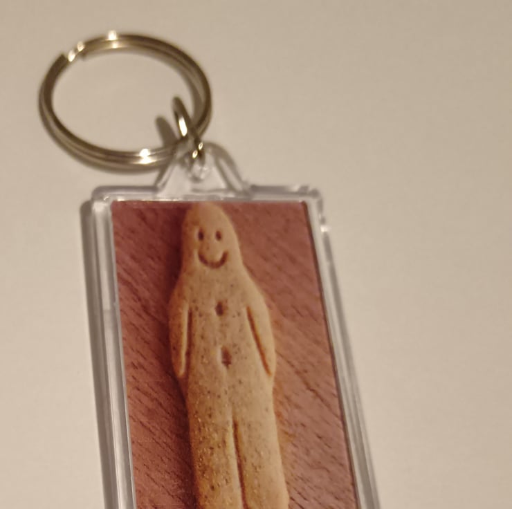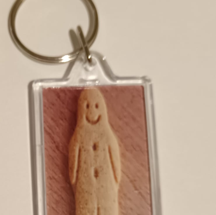 Small rectangular keyring featuring photography of a cute christmas gingerbread man. Photography taken by myself. Opposite side is blank.
