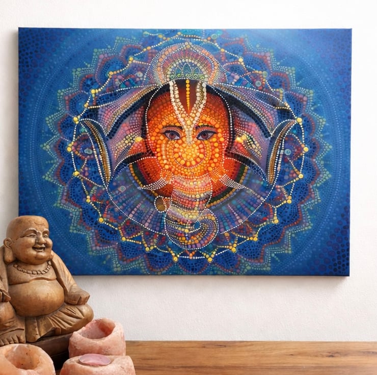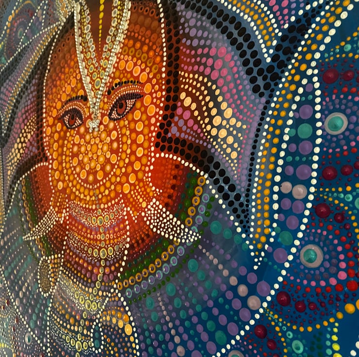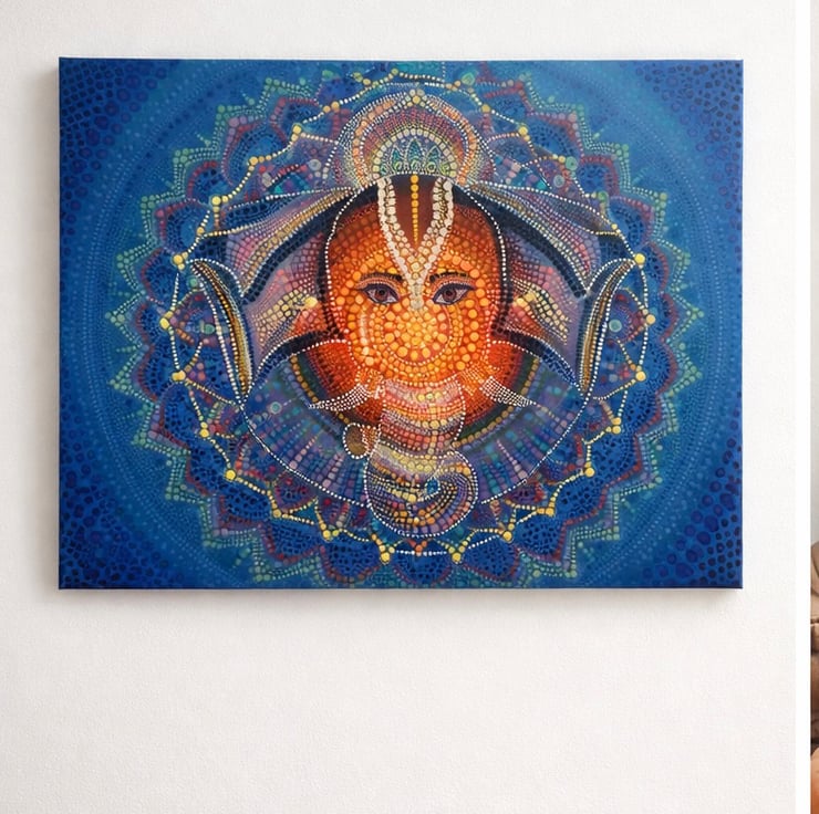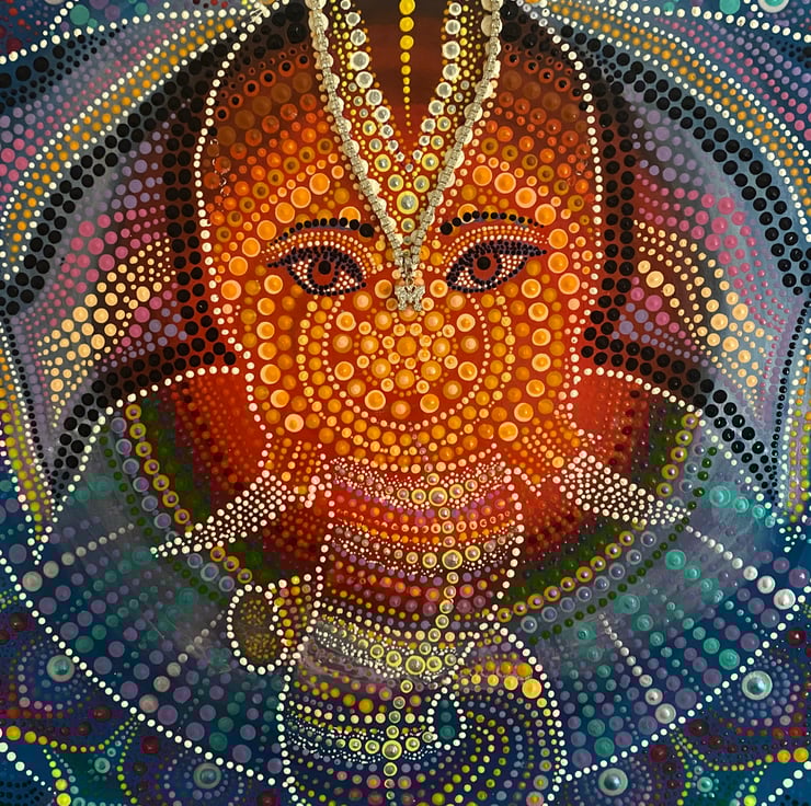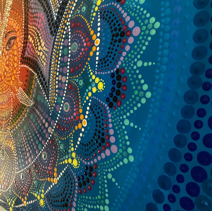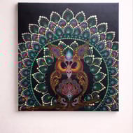 At its centre is a calm, watchful presence, surrounded by layered dot work and mandala pattern that emerged slowly and deliberately. The process was intuitive yet disciplined, allowing rhythm, symmetry, and stillness to guide the work rather than forcing a fixed design.