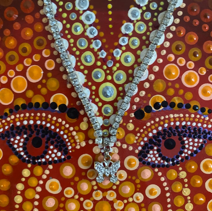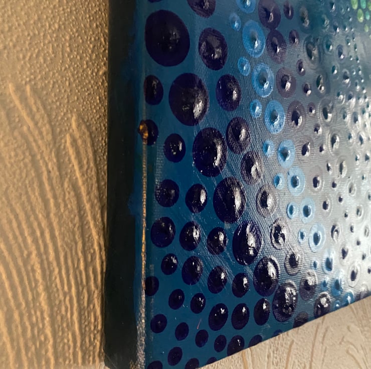 This artwork is intended for decorative indoor use only. It is a hand-painted acrylic artwork on stretched canvas and contains small decorative embellishments which are securely attached. Please ensure the artwork is hung securely using appropriate wall fixings suitable for the wall type and the weight of the piece. Not suitable for children’s play. Keep out of reach of small children. Materials used include acrylic paint, canvas, wood stretcher frame, adhesive, and decorative embellishments.