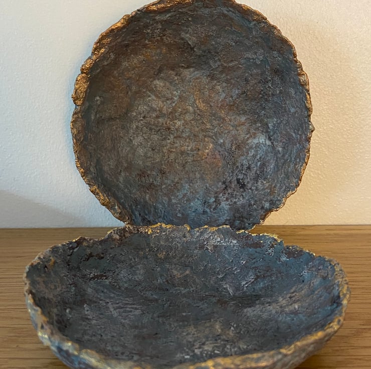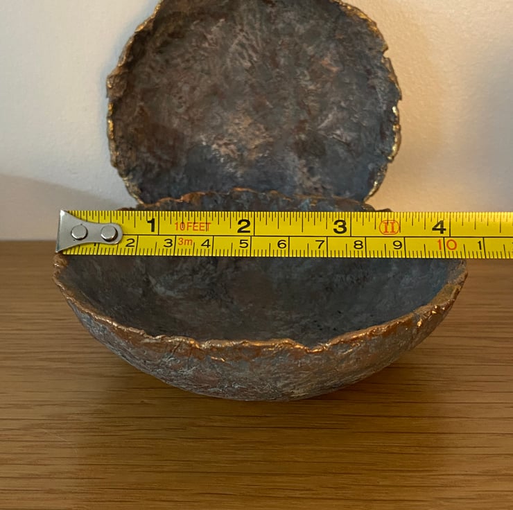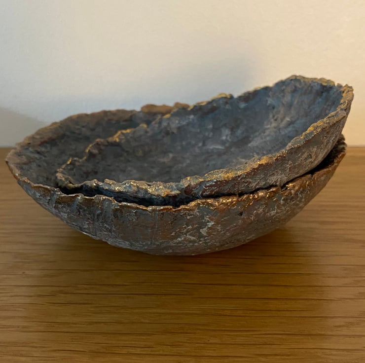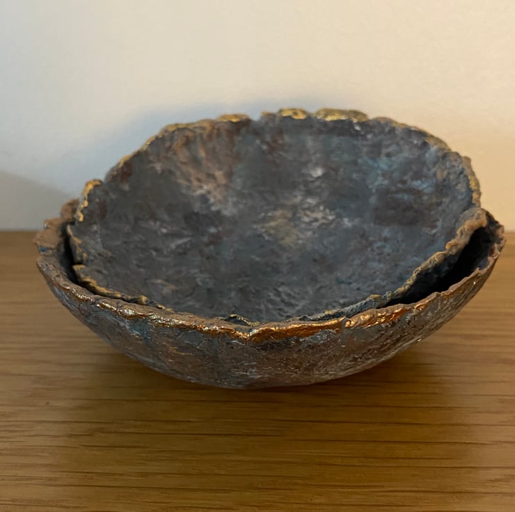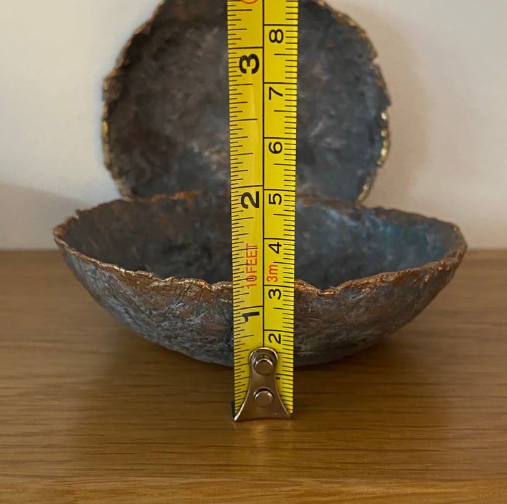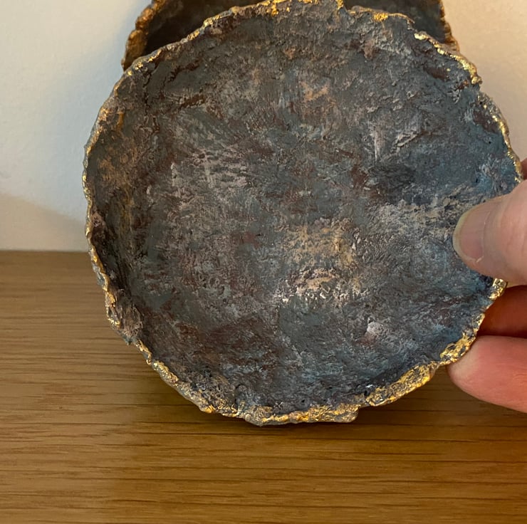 I have painted the bowls to look like faux stone with a hint of metallic to look like an ore. Touches of gold and copper highlight the rustic textures.