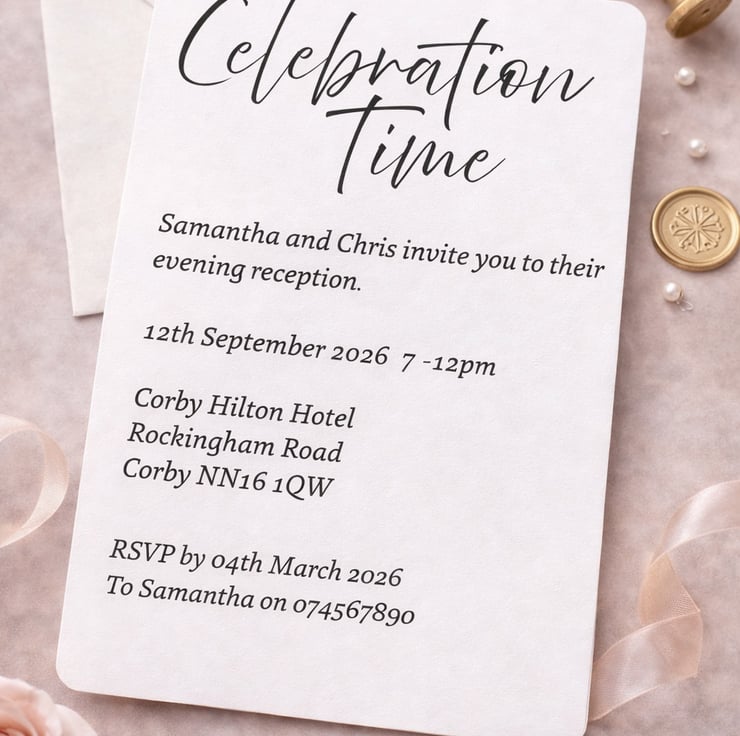 A beautifully simple and elegant evening wedding invitation, designed to invite your guests to celebrate with you after the ceremony. This personalised Celebration Time card is professionally printed on premium white card stock and finished with softly rounded corners for a timeless, modern look. It forms part of a fully matching wedding stationery set, allowing you to coordinate your Save the Dates, invitations, RSVP cards, details cards and place names seamlessly. Each invitation is handmade to order and supplied with a matching handmade envelope, making it perfect for evening receptions, wedding celebrations or post-ceremony parties