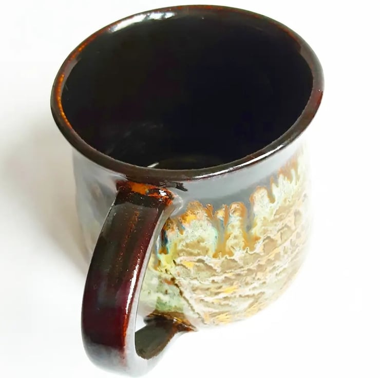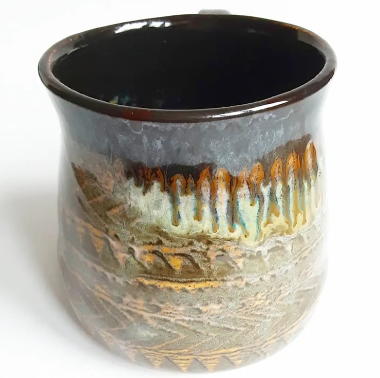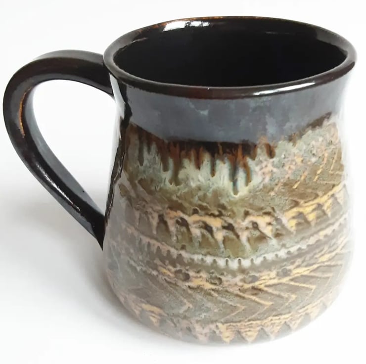 Glazed in brown glazes with a pattern on the mug.