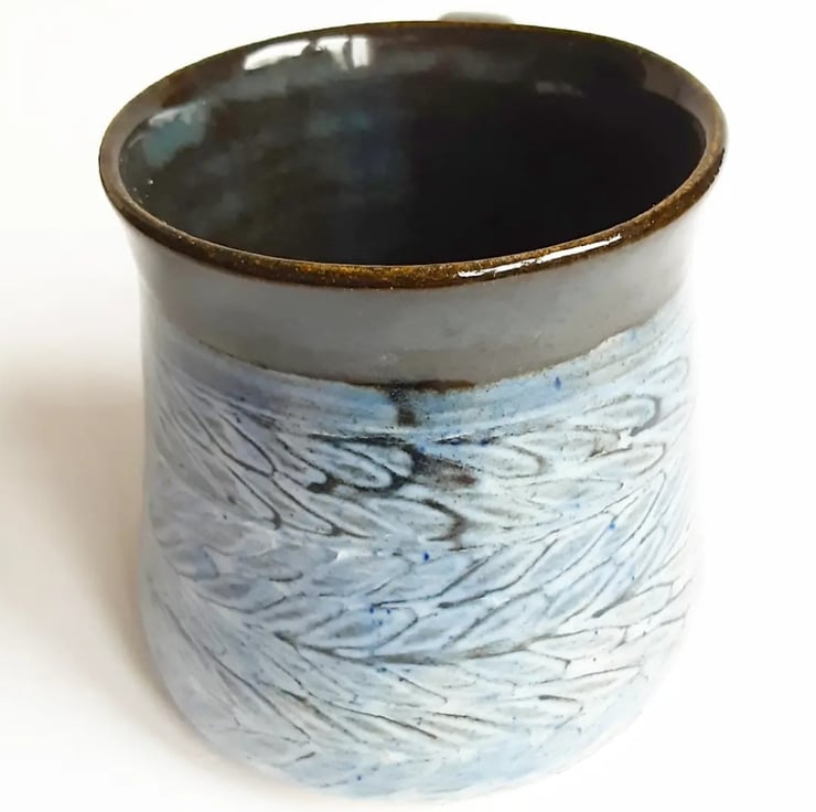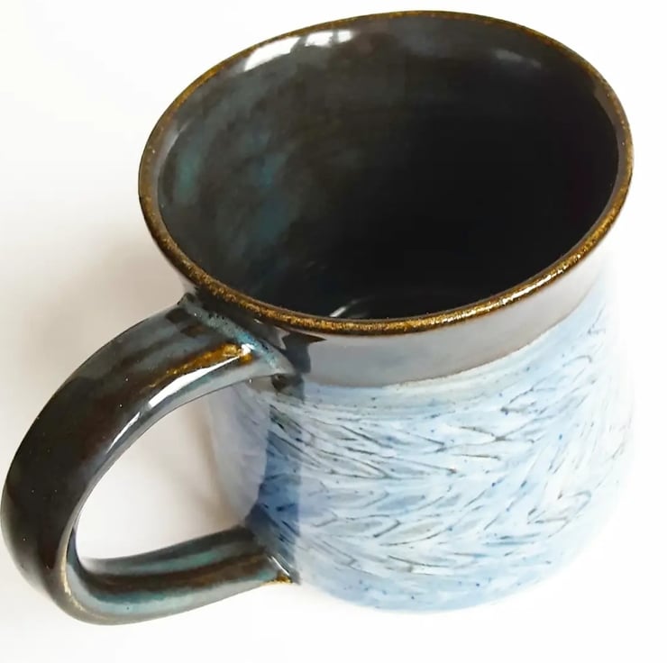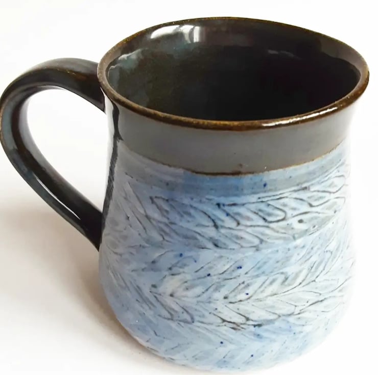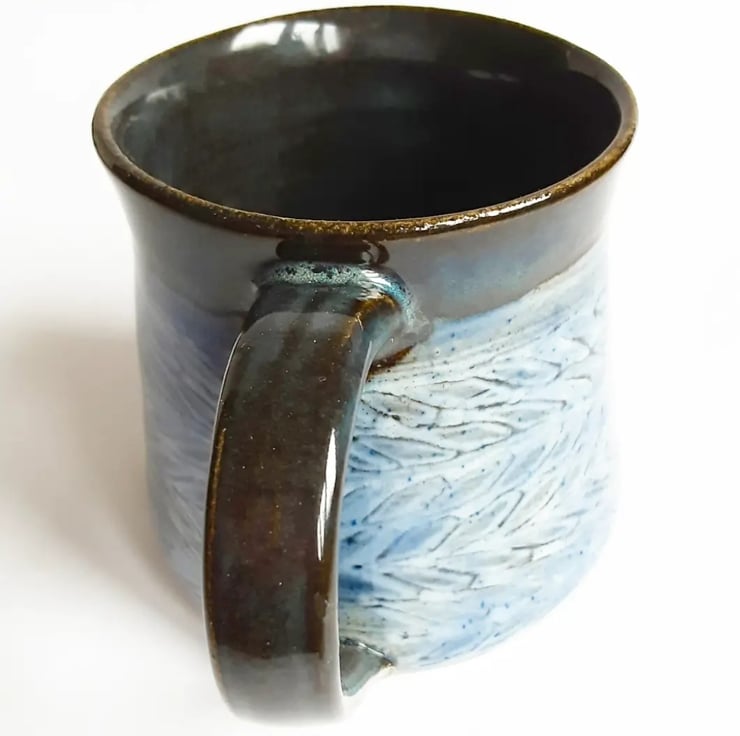 Glazed in blue glazes with a pattern on the mug.