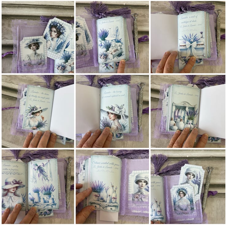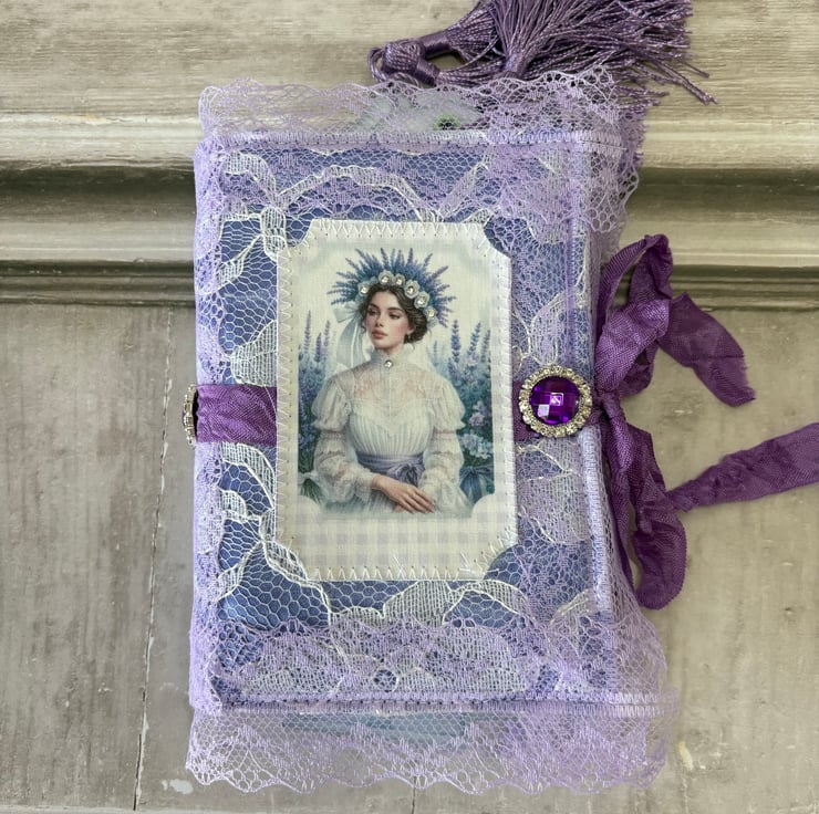 Journal measures 5.5" x 4" x 1" (14cm x 10.2cm x 2.5cm). 3 signatures with total of 72 pages. Cover is lavender satin overlaid with lace, embellished with an image of a lavender lady printed onto fabric, diamonds on her crown. Lined with lilac cotton, lace pocket across the bottom, holding 4 journal cards. 36 pages are printed, the other 36 are palest lilac. secured with a ribbon tie.
