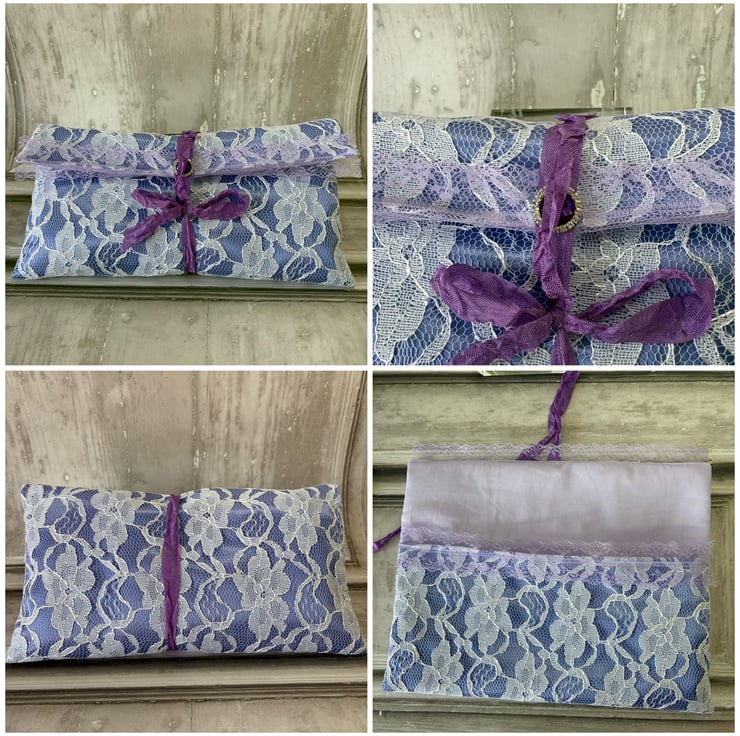 Lavender Mini Journal with Flip Tags presented in a lavender satin clutch overlaid with lace and ties with a purple ribbon.