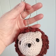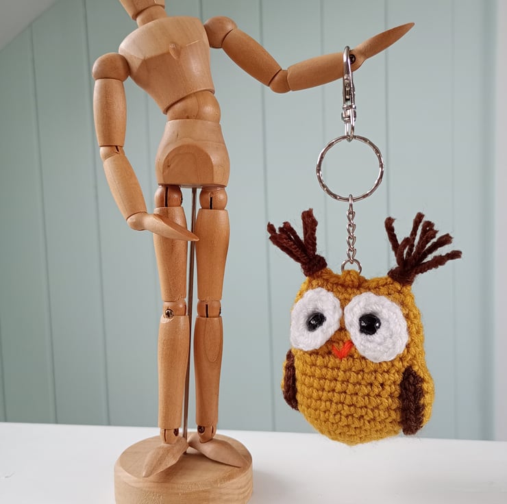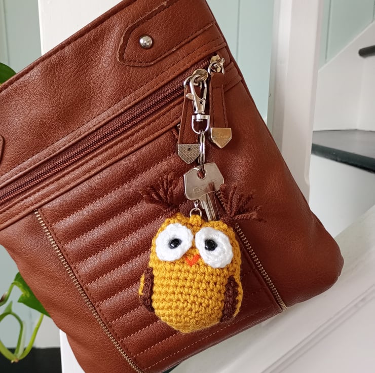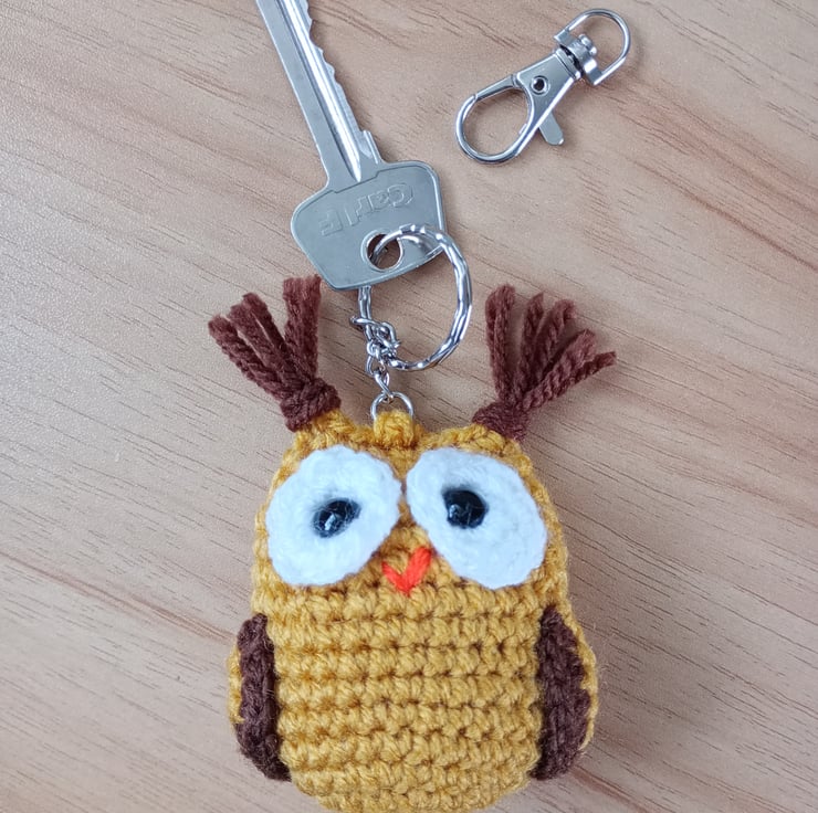 He is made from acrylic yarn and measuring approximately 6cm x 8cm in a deep mustard yellow with chestnut brown trim on his wings and ear tufts, large white eyes and black safety eyes and orange embroidered beak. With a metal chain, ring and lobster clasp to easily attach to keys or bags. The clasp can be removed from the ring if preferred. His body is stuffed with toy stuffing to give him a plump body.
