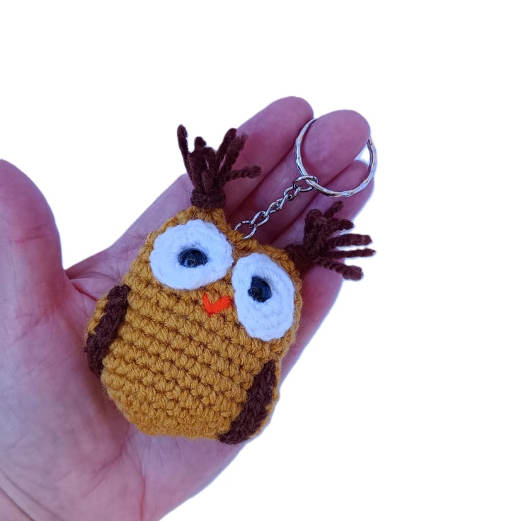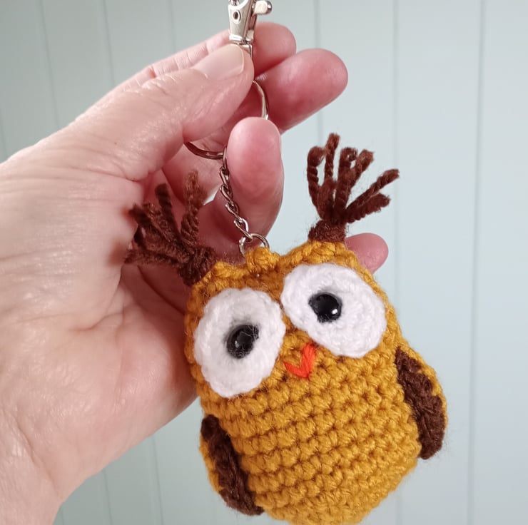 He is made from acrylic yarn and measures approximately 6cm x 8cm in a deep mustard yellow with chestnut brown trim on his wings and ear tufts, large white eyes rings and black safety eyes with an orange embroidered beak.