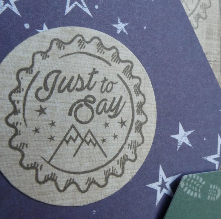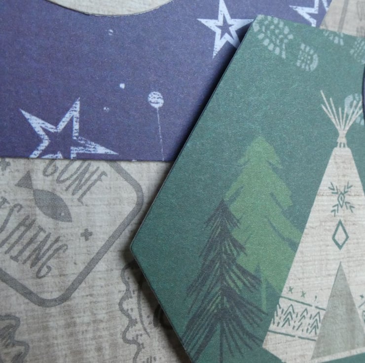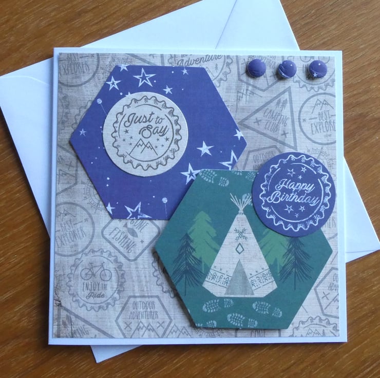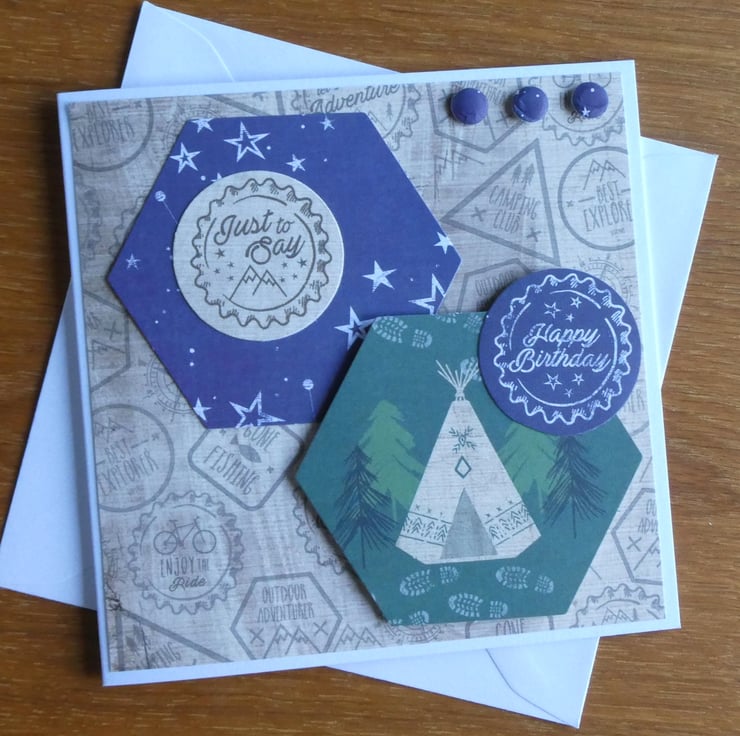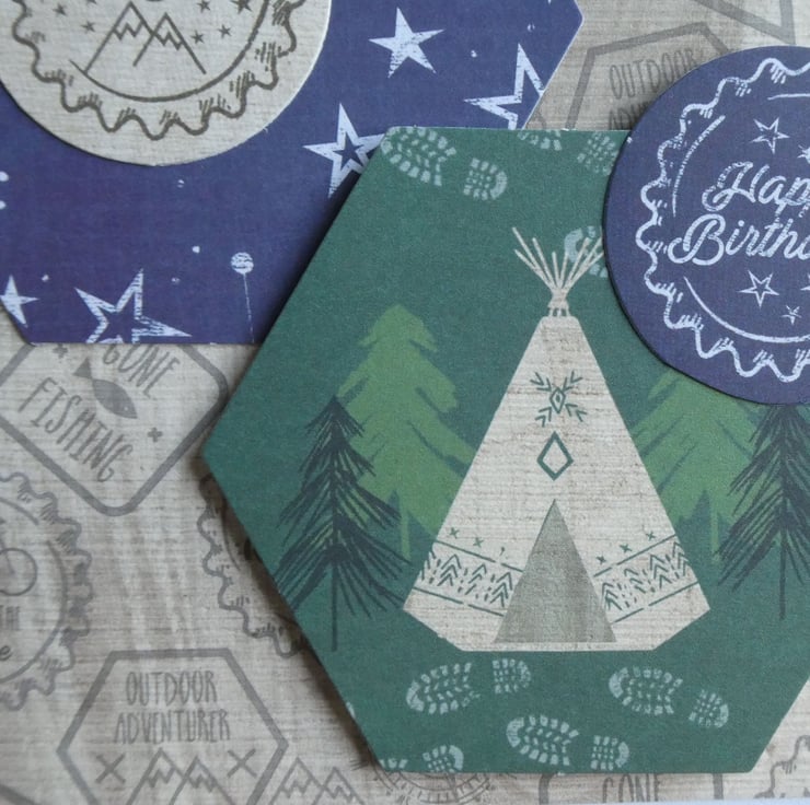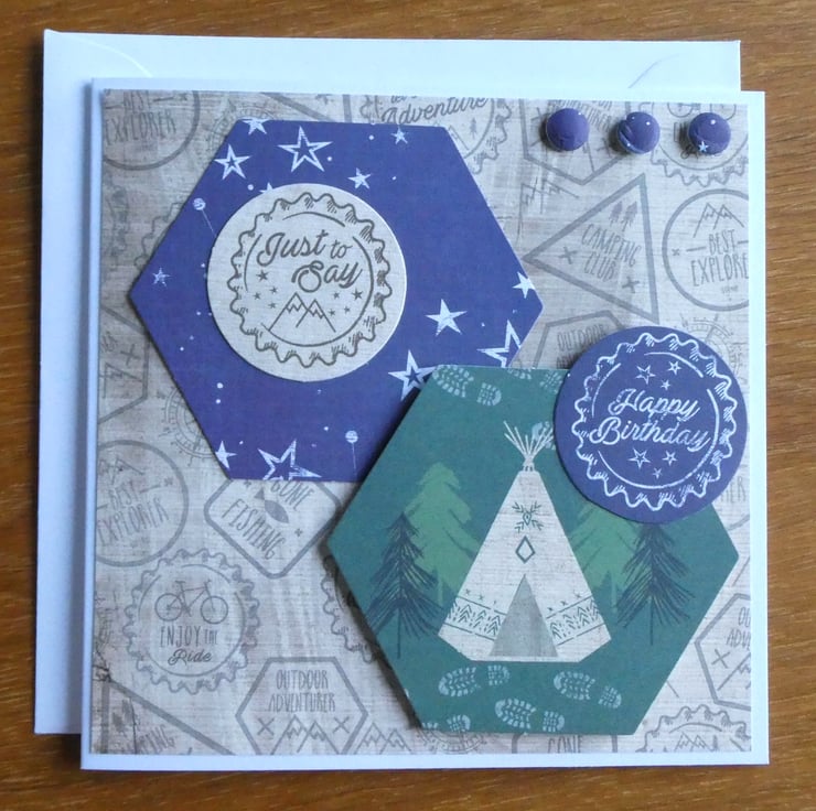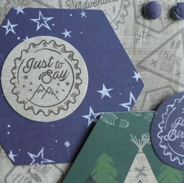 Two hexagonal toppers have been added, one with a night sky design and one with a teepee and trees. Two circular messages, one with the words Just to Say and one with Happy Birthday and 3 card 'buttons' have been added to complete the design.