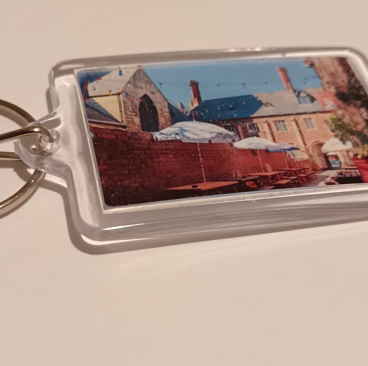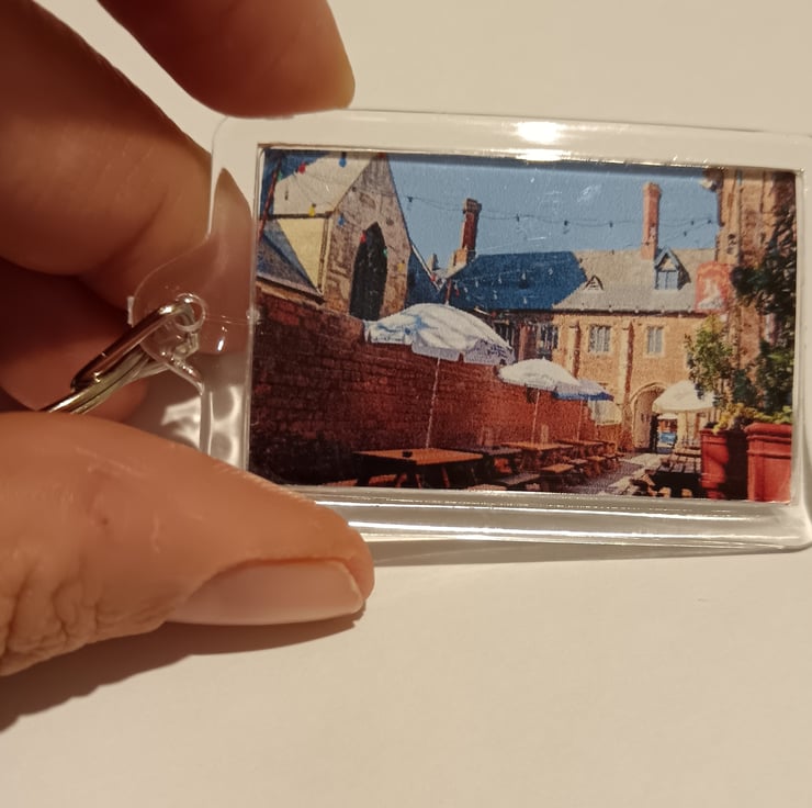 Small rectangular keyring featuring photography of Cafe Rene pub garden in the daytime. Photography taken by myself. Opposite side is blank.